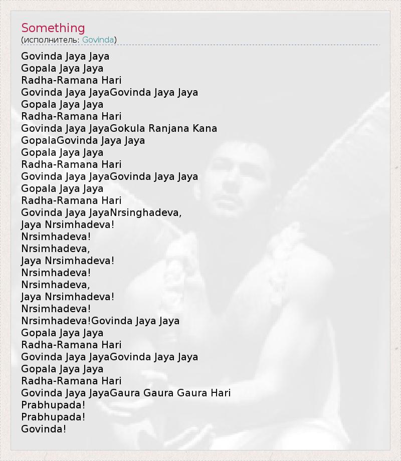 Govinda Jaya Jaya Gopala Jaya Jaya Radha-Ramana Hari Govinda Jaya JayaGovinda Jaya Jaya Gopala Jaya Jaya Radha-Ramana Hari Govinda Jaya JayaGokula Ranjana Kana GopalaGovinda Jaya Jaya Gopala Jaya Jaya Radha-Ramana Hari Govinda Jaya JayaGovinda Jaya Jaya Gopala Jaya Jaya Radha-Ramana Hari Govinda Jaya JayaNrsinghadeva, Jaya Nrsimhadeva! Nrsimhadeva! Nrsimhadeva, Jaya Nrsimhadeva! Nrsimhadeva! Nrsimhadeva, Jaya Nrsimhadeva! Nrsimhadeva! Nrsimhadeva!Govinda Jaya Jaya Gopala Jaya Jaya Radha-Ramana Hari Govinda Jaya JayaGovinda Jaya Jaya Gopala Jaya Jaya Radha-Ramana Hari Govinda Jaya JayaGaura Gaura Gaura Hari Prabhupada! Prabhupada! Govinda!