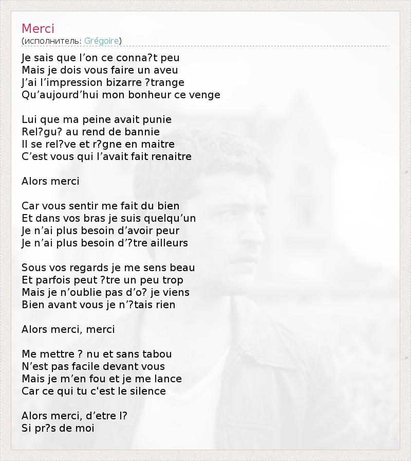 Je sais que l’on ce conna?t peu Mais je dois vous faire un aveu J’ai l’impression bizarre ?trange Qu’aujourd’hui mon bonheur ce venge Lui que ma peine avait punie Rel?gu? au rend de bannie Il se rel?ve et r?gne en maitre C’est vous qui l’avait fait renaitre Alors merci Car vous sentir me fait du bien Et dans vos bras je suis quelqu’un Je n’ai plus besoin d’avoir peur Je n’ai plus besoin d’?tre ailleurs Sous vos regards je me sens beau Et parfois peut ?tre un peu trop Mais je n’oublie pas d’o? je viens Bien avant vous je n’?tais rien Alors merci, merci Me mettre ? nu et sans tabou N’est pas facile devant vous Mais je m’en fou et je me lance Car ce qui tu c'est le silence Alors merci, d’etre l? Si pr?s de moi