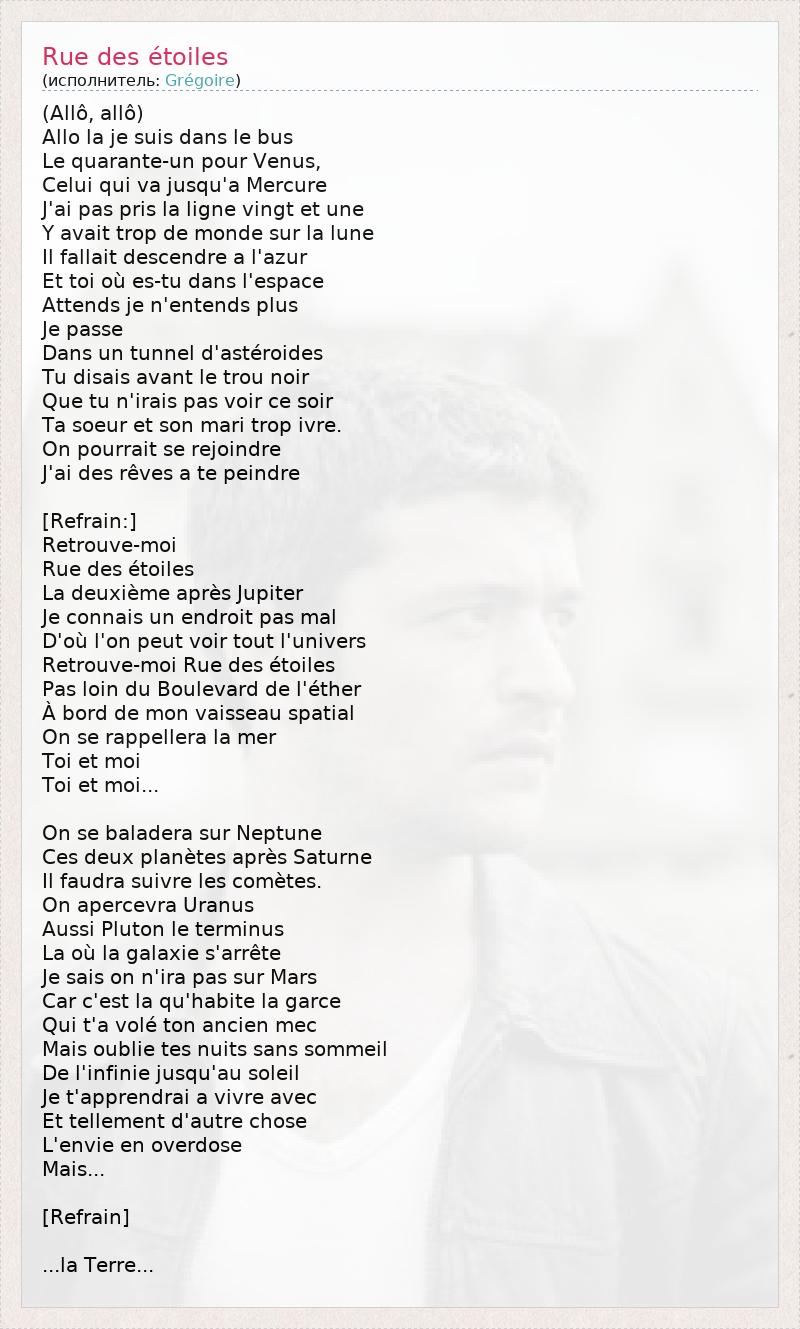 Это интересно:Grégoire стал первым музыкантом, чей альбом был выпущен на средства интернет-пользователей, собравший для реализации задуманного 70 тысяч евро. Сингл «Rue des Etoiles» оказался не менее успешным и активно ротируется на радиостанциях, а на концерты гастрольного тура, который стартует весной, проданы уже почти все билеты.