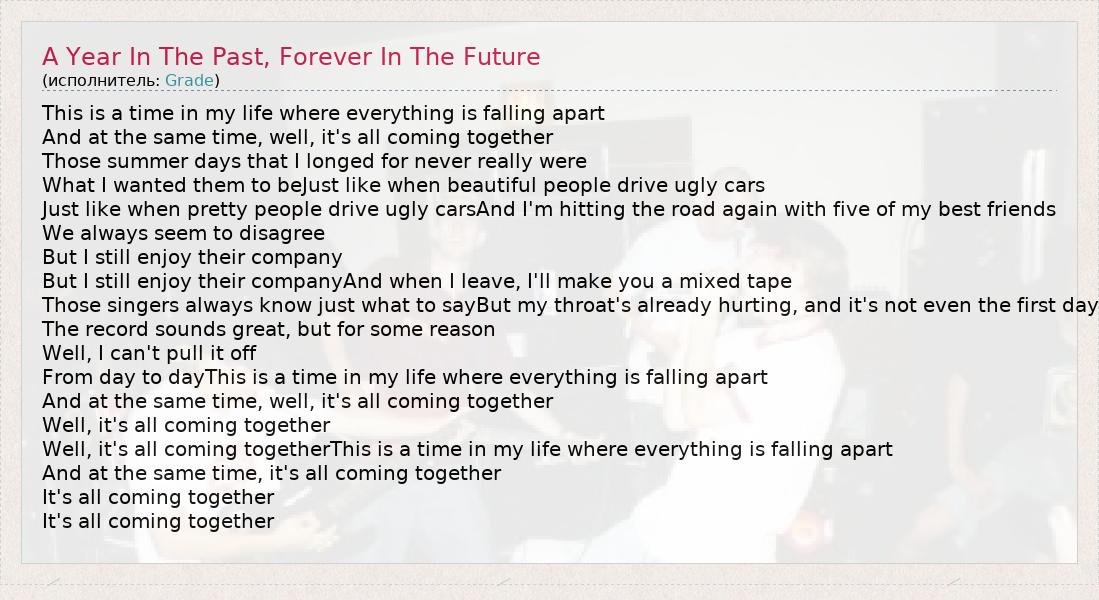 This is a time in my life where everything is falling apart And at the same time, well, it's all coming together Those summer days that I longed for never really were What I wanted them to beJust like when beautiful people drive ugly cars Just like when pretty people drive ugly carsAnd I'm hitting the road again with five of my best friends We always seem to disagree But I still enjoy their company But I still enjoy their companyAnd when I leave, I'll make you a mixed tape Those singers always know just what to sayBut my throat's already hurting, and it's not even the first day The record sounds great, but for some reason Well, I can't pull it off From day to dayThis is a time in my life where everything is falling apart And at the same time, well, it's all coming together Well, it's all coming together Well, it's all coming togetherThis is a time in my life where everything is falling apart And at the same time, it's all coming together It's all coming together It's all coming together