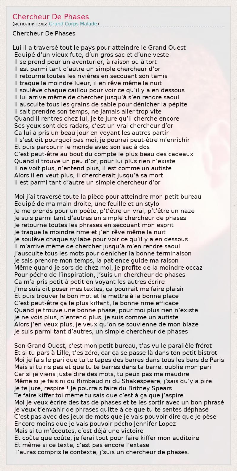 Chercheur De Фазы Луи ильTraverse зазывают ле платит залить atteindre ле Гран Ouest Equipe d' ООН Vieux Fute , d' ООН , Большой мешок ET d' Une Весте Il себе Prend залить ип aventurier , à RAISON НУ ДЕЛИКАТНОГО Il оц Parmi Tant d' Autre ООН простой chercheur d' или Il retourne Toutes ле Rivières ан secouant сын Тамис Il Traque ла moindre lueur , иль ан rêve même La Nuit Il soulève Chaque Кейллу залить ВОИР се qu'il я ан нижние белье Il луй прибыть мем де Chercher jusqu'à s'en rendre saoul Il ausculte Tous Les зерна де соболя залить dénicher ла pépite Ил Саит prendre сын секретари , пе Jamais Aller Троп физации Quand иль rentres Chez луй , я люблю те юре qu'il Шерше бис Ses Yeux SONT де радары , c'est ООН уга chercheur d' или Са -луйPRIS ООН кавалер Jour ан Voyant ле Autres partir Il s'est дит Pourquoi Pas Moi , я люблю pourrai Peut - être m'enrichir Et Puis parcourir Le Monde АВЭК сын Мешком DOS C'est Peut - être а.е. бой дю Compte ле плюс кавалер де CADEAUX Quand иль TROUVE ООН ПЭУ d' или , залить луй плюс Rien n'existe Il пе Войт плюс , n'entend плюс , иль оц Comme ООН autiste Alors иль ан veut плюс , иль chercherait jusqu'à са Морт Il оц Parmi Tant d' Autre ООН простой chercheur d' или Moi j'ai Traverse Toute ла pièce залить atteindre Mon Petit бюро Equipe де ма главный Droite , ипе Feuille др ООН стило Je меня Prends залить ип Poete , p't'être ип Vrai , p't'être ип Naze Je Suis Parmi Tant d' Autres Звучит простые chercheur де фазы Je retourne Toutes ле фразы ан secouant пн Esprit Je Traque ла moindre изморозь др J'en rêve même La Nuit Je soulève Chaque слог залить ВОИР се qu'il я ан нижние белье Il m'arrive même де Chercher jusqu'à m'en rendre saoul J'ausculte Tous Les словечки залить dénicher La Bonne terminaison Je саис prendre Пн секретари , ла руководство терпение ма Raison Мем Quand JE чики -де Chez Moi , я люблю Прибыльных -де-ла moindre Occaz Налейте Pecho де l' вдохновение , j'suis Звучит chercheur де фазы Ca m'a PRIS мелкий мелкое ан Voyant ле Autres écrire J'me суис дит позер МЧС Textes , Калифорния pourrait меня свободной конкуренции Plaisir Et Puis trouver Ле Бон словцо др ле Mettre à La Bonne место C'est Peut - être ça ле плюс kiffant , La Bonne изморозь Efficace Quand JE фаза TROUVE Une Bonne , залить Moi плюс Rien n'existe Je пе VOIS плюс , n'entend плюс , Je Suis Comme ООН autiste Alors J'en Veux плюс , я люблю Veux qu'on себе souvienne де пн пожар Je Suis Parmi Tant d' Autres ООН простые chercheur де фазы Сын Великого Запада , c'est Mon Petit бюро , T'as вю ле Параллельная frérot Et си ту Парс à Лилль, T'es нулю, автомобиля CA таковой PASSE là Dans тонн мелкой бистро Ленты Moi Je Fais ле Пари Que TU Пе де Barres Dans Tous Les бары -де-Пари Mais си ту RIS па др Que Tu те Баррес данс та Барре , oublié Пн Пари Автомобиль си JE Viens Жюст тяжелым де словечки , ту peux па меня maudire Мем си JE Fais Ni -дю- Рембо Ni -дю- Шекспир , j'sais qu'yPire Je те юре , вдыхаю! Je pourrais свободной конкуренции дю Бритни Спирс Те свободной конкуренции Kiffer тои même ту саис Que c'est ЦС Que j'aspire Moi JE Veux écrire де TAS -де- фазы и др те ле Sortir АВЭК ООН Бон фразу Je Veux t'envahir де фразы Quitte СЕ Que Tu те Sentes расфазировку C'est па АВЭК де Jeux де словечки Que JE Вайс pouvoir тяжелым Que JE pèse Encore Moins Que JE Вайс pouvoir Pecho Дженнифер Лопес Mais си Вт m'écoutes , c'est дежа Une Виктуар Et coûte Que coûte , я люблю ferai зазывают залить FAIRE Kiffer Пн auditoire Et même си се подробное описание , c'est па- бис l' Экстаз T'auras КОМПРИС ле contexte , j'suis Звучит chercheur де фаз .