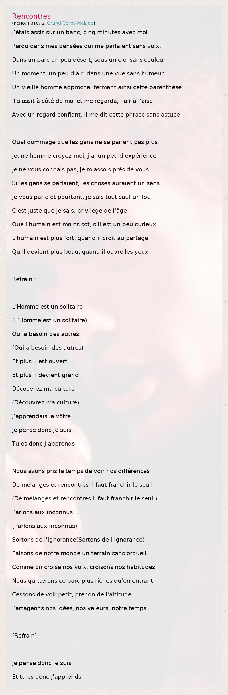 J'étais assis sur un banc, cinq minutes avec moi Perdu dans mes pensées qui me parlaient sans voix, Dans un parc un peu désert, sous un ciel sans couleur Un moment, un peu d'air, dans une vue sans humeur Un vieille homme approcha, fermant ainsi cette parenthèse Il s'assit à côté de moi et me regarda, l'air à l'aise Avec un regard confiant, il me dit cette phrase sans astuce Quel dommage que les gens ne se parlent pas plus Jeune homme croyez-moi, j'ai un peu d'expérience Je ne vous connais pas, je m'assois près de vous Si les gens se parlaient, les choses auraient un sens Je vous parle et pourtant, je suis tout sauf un fou C'est juste que je sais, privilège de l'âge Que l'humain est moins sot, s'il est un peu curieux L'humain est plus fort, quand il croit au partage Qu'il devient plus beau, quand il ouvre les yeux Refrain : L'Homme est un solitaire (L'Homme est un solitaire) Qui a besoin des autres (Qui a besoin des autres) Et plus il est ouvert Et plus il devient grand Découvrez ma culture (Découvrez ma culture) J'apprendais la vôtre Je pense donc je suis Tu es donc j'apprends Nous avons pris le temps de voir nos différences De mélanges et rencontres il faut franchir le seuil (De mélanges et rencontres il faut franchir le seuil) Parlons aux inconnus (Parlons aux inconnus) Sortons de l'ignorance(Sortons de l'ignorance) Faisons de notre monde un terrain sans orgueil Comme on croise nos voix, croisons nos habitudes Nous quitterons ce parc plus riches qu'en entrant Cessons de voir petit, prenon de l'altitude Partageons nos idées, nos valeurs, notre temps (Refrain) Je pense donc je suis Et tu es donc j'apprends