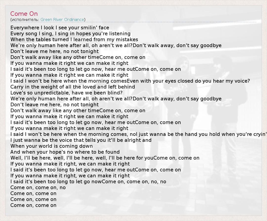 Everywhere I look I see your smilin' face Every song I sing, I sing in hopes you're listening When the tables turned I learned from my mistakes We're only human here after all, oh aren't we all?Don't walk away, don't say goodbye Don't leave me here, no not tonight Don't walk away like any other timeCome on, come on If you wanna make it right we can make it right I said it's been too long to let go now, hear me outCome on, come on If you wanna make it right we can make it right I said I won't be here when the morning comesEven with your eyes closed do you hear my voice? Carry in the weight of all the loved and left behind Love's so unpredictable, have we been blind? We're only human here after all, oh aren't we all?Don't walk away, don't say goodbye Don't leave me here, no not tonight Don't walk away like any other timeCome on, come on If you wanna make it right we can make it right I said it's been too long to let go now, hear me outCome on, come on If you wanna make it right we can make it right I said I won't be here when the morning comes, noI just wanna be the hand you hold when you're cryin' I just wanna be the voice that tells you it'll be alright and When your world is coming down And when your hope's no where to be found Well, I'll be here, well, I'll be here, well, I'll be here for youCome on, come on If you wanna make it right, we can make it right I said it's been too long to let go now, hear me outCome on, come on If you wanna make it right, we can make it right I said it's been too long to let go nowCome on, come on, no, no Come on, come on, no Come on, come on Come on, come on Come on, come on