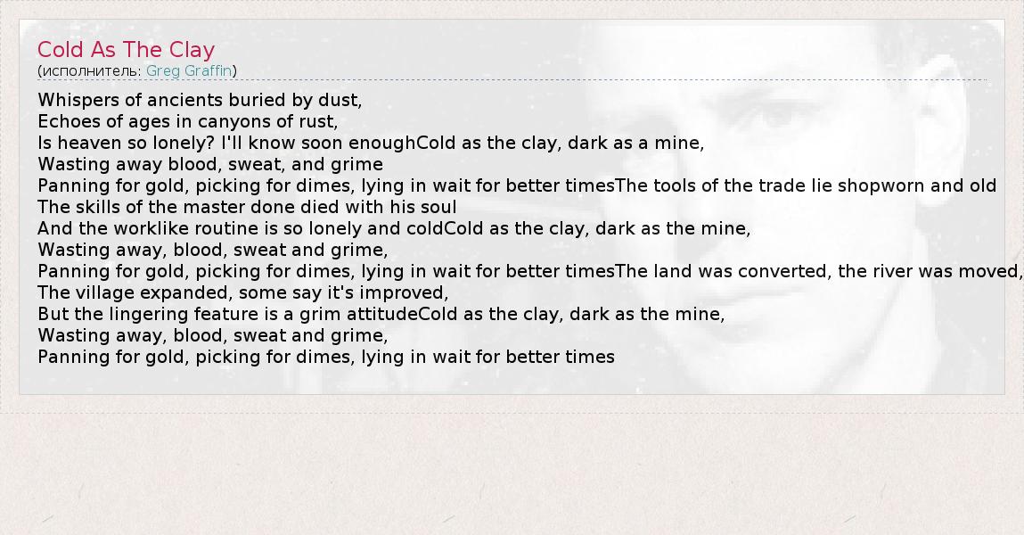 Whispers of ancients buried by dust, Echoes of ages in canyons of rust, Is heaven so lonely? I'll know soon enoughCold as the clay, dark as a mine, Wasting away blood, sweat, and grime Panning for gold, picking for dimes, lying in wait for better timesThe tools of the trade lie shopworn and old The skills of the master done died with his soul And the worklike routine is so lonely and coldCold as the clay, dark as the mine, Wasting away, blood, sweat and grime, Panning for gold, picking for dimes, lying in wait for better timesThe land was converted, the river was moved, The village expanded, some say it's improved, But the lingering feature is a grim attitudeCold as the clay, dark as the mine, Wasting away, blood, sweat and grime, Panning for gold, picking for dimes, lying in wait for better times