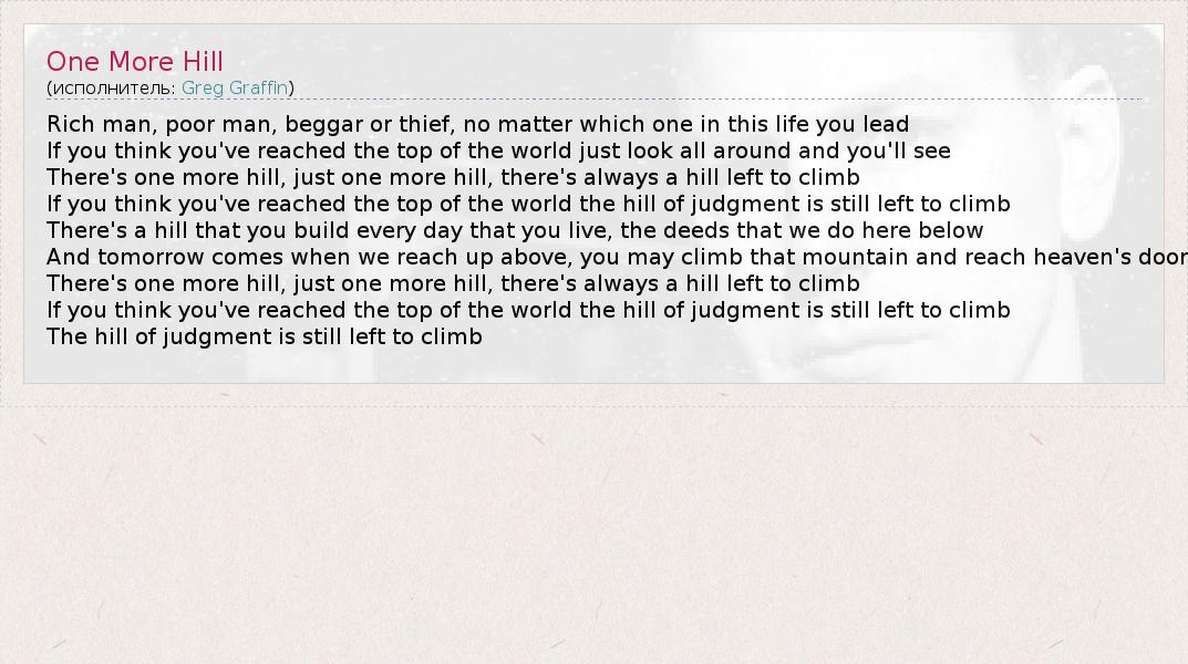 Это интересно:Грэг Граффин (Gregory Walter Graffin, родился 6 ноября 1964 г. в штате Висконсин) - вокалист и один из основателей панк-группы Bad Religion. Записал два сольных акустических фолк-альбома: American Lesion (1997) и Cold as the Clay (2006).