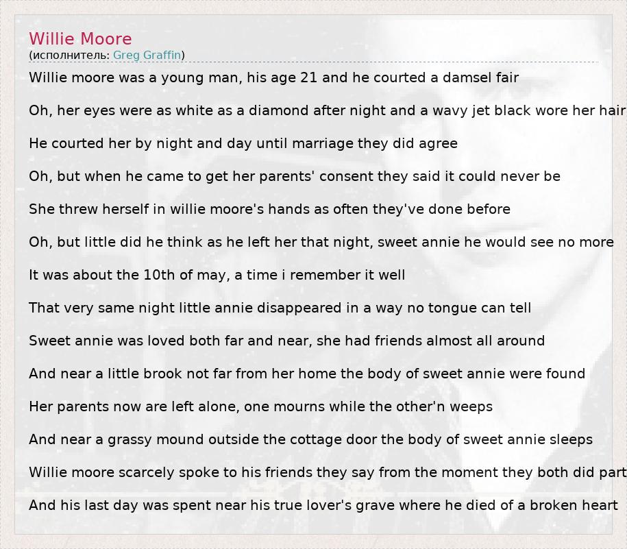 Willie moore was a young man, his age 21 and he courted a damsel fair Oh, her eyes were as white as a diamond after night and a wavy jet black wore her hair He courted her by night and day until marriage they did agree Oh, but when he came to get her parents' consent they said it could never be She threw herself in willie moore's hands as often they've done before Oh, but little did he think as he left her that night, sweet annie he would see no more It was about the 10th of may, a time i remember it well That very same night little annie disappeared in a way no tongue can tell Sweet annie was loved both far and near, she had friends almost all around And near a little brook not far from her home the body of sweet annie were found Her parents now are left alone, one mourns while the other'n weeps And near a grassy mound outside the cottage door the body of sweet annie sleeps Willie moore scarcely spoke to his friends they say from the moment they both did part And his last day was spent near his true lover's grave where he died of a broken heart