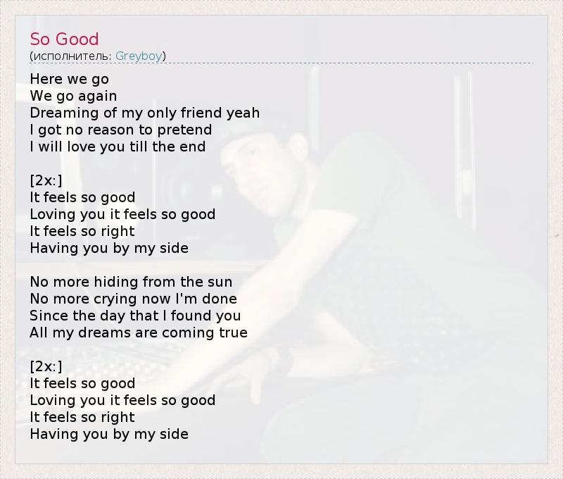 Here we go We go again Dreaming of my only friend yeah I got no reason to pretend I will love you till the end [2x:] It feels so good Loving you it feels so good It feels so right Having you by my side No more hiding from the sun No more crying now I'm done Since the day that I found you All my dreams are coming true [2x:] It feels so good Loving you it feels so good It feels so right Having you by my side