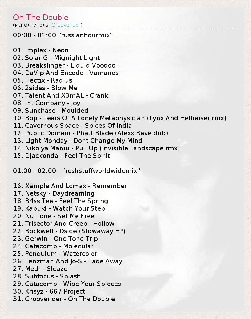 00:00 - 01:00 "russianhourmix" 01. Implex - Neon 02. Solar G - Mignight Light 03. Breakslinger - Liquid Voodoo 04. DaVip And Encode - Vamanos 05. Hectix - Radius 06. 2sides - Blow Me 07. Talent And X3mAL - Crank 08. Int Company - Joy 09. Sunchase - Moulded 10. Bop - Tears Of A Lonely Metaphysician (Lynx And Hellraiser rmx) 11. Cavernous Space - Spices Of India 12. Public Domain - Phatt Blade (Alexx Rave dub) 13. Light Monday - Dont Change My Mind 14. Nikolya Maniu - Pull Up (Invisible Landscape rmx) 15. Djackonda - Feel The Spirit 01:00 - 02:00 "freshstuffworldwidemix" 16. Xample And Lomax - Remember 17. Netsky - Daydreaming 18. B4ss Tee - Feel The Spring 19. Kabuki - Watch Your Step 20. Nu:Tone - Set Me Free 21. Trisector And Creep - Hollow 22. Rockwell - Dside (Stowaway EP) 23. Gerwin - One Tone Trip 24. Catacomb - Molecular 25. Pendulum - Watercolor 26. Lenzman And Jo-S - Fade Away 27. Meth - Sleaze 28. Subfocus - Splash 29. Catacomb - Wipe Your Spieces 30. Krisyz - 667 Project 31. Grooverider - On The Double