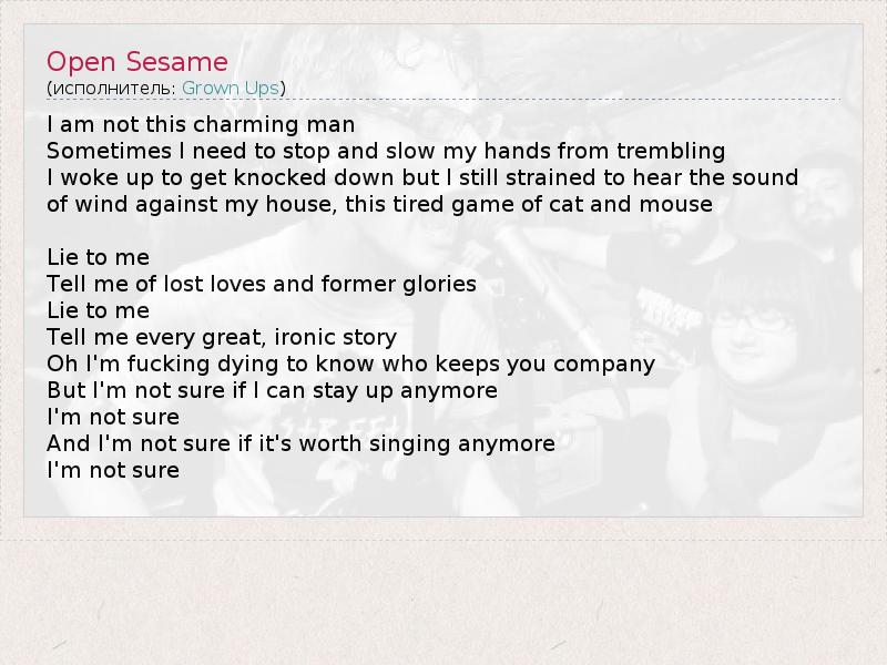 I am not this charming man Sometimes I need to stop and slow my hands from trembling I woke up to get knocked down but I still strained to hear the sound of wind against my house, this tired game of cat and mouse Lie to me Tell me of lost loves and former glories Lie to me Tell me every great, ironic story Oh I'm fucking dying to know who keeps you company But I'm not sure if I can stay up anymore I'm not sure And I'm not sure if it's worth singing anymore I'm not sure