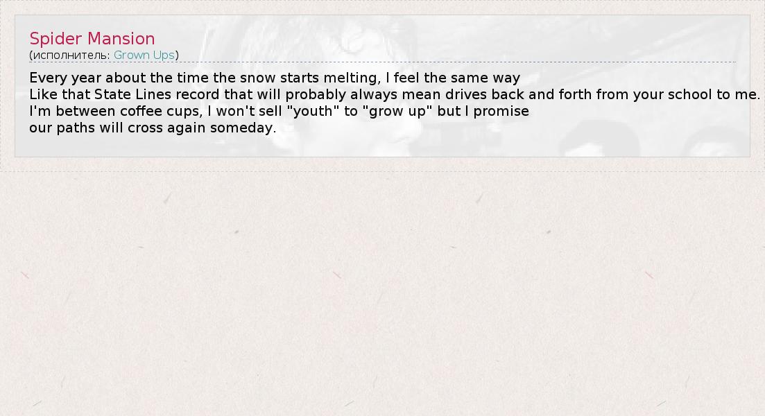 Это интересно:Представьте себе более грубый Lifetime и вы получите представление о Grown Ups. Находясь где-то между эмо и поп-панком, Grown Ups являются одним из ярких открытий открытий последнего года. Сформировавшись из бывших участников Lions Of The North, Grown Ups напоминают такие группы как Braid, Latterman и во многом Street Smart Cyclist. Энергия, которая исходит от группы является по крайней мере заразительной. Сыроватые, но до жути... продолжение