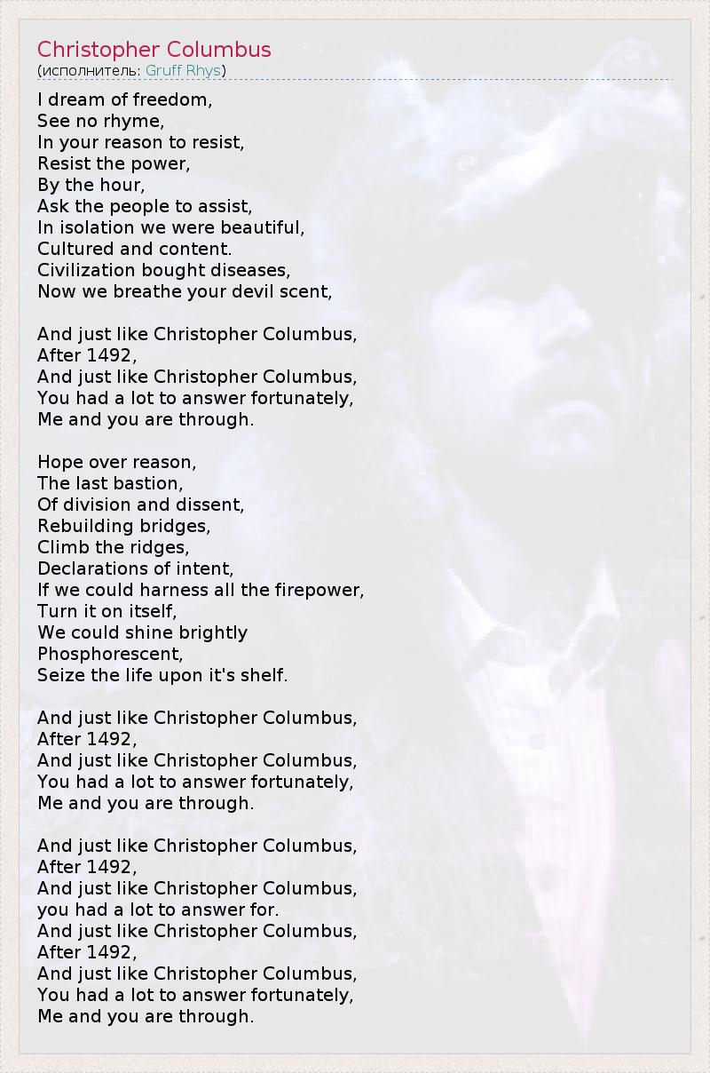 I dream of freedom, See no rhyme, In your reason to resist, Resist the power, By the hour, Ask the people to assist, In isolation we were beautiful, Cultured and content. Civilization bought diseases, Now we breathe your devil scent, And just like Christopher Columbus, After 1492, And just like Christopher Columbus, You had a lot to answer fortunately, Me and you are through. Hope over reason, The last bastion, Of division and dissent, Rebuilding bridges, Climb the ridges, Declarations of intent, If we could harness all the firepower, Turn it on itself, We could shine brightly Phosphorescent, Seize the life upon it's shelf. And just like Christopher Columbus, After 1492, And just like Christopher Columbus, You had a lot to answer fortunately, Me and you are through. And just like Christopher Columbus, After 1492, And just like Christopher Columbus, you had a lot to answer for. And just like Christopher Columbus, After 1492, And just like Christopher Columbus, You had a lot to answer fortunately, Me and you are through.