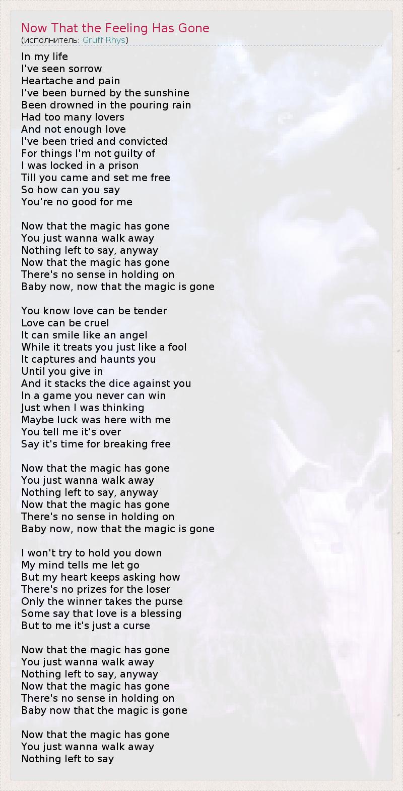 В своей жизни, Я видел горе, Страдание и боль. Меня обжигало палящее солнце, Я утопал в проливном дожде. Было слишком много любовниц И недостаточно любви... Меня судили и признали виновным В преступлениях, которые я не совершал. Я был заперт в тюрьме, Пока не пришла ты и не освободила меня, И как ты можешь говорить, Что ты не нужна мне? Сейчас, когда волшебство прошло, Ты просто хочешь уйти... Нечего сказать, в любом случае Сейчас, когда волшебство прошло, Нет смысла удерживать Тебя малыш, сейчас, когда волшебство прошло... Ты знаешь, любовь может быть нежной, Любовь может быть жестокой, Может ангельски улыбаться, Дурача тебя... Она увлечет тебя, и будет преследовать, Пока ты не сдашься, И будет играть с тобой В игру, в которой ты никогда не сможешь выиграть... И я подумал, Возможно, удача была здесь со мной. Ты говоришь, что все кончено, Говоришь, что пришло время стать свободными... Сейчас, когда волшебство прошло, Ты просто хочешь уйти... Нечего сказать, в любом случае Сейчас, когда волшебство прошло, Нет смысла удерживать Тебя малыш, сейчас, когда волшебство прошло... Я не буду пытаться удержать тебя. Мой разум говорит мне - отпусти, Но мое сердце продолжает спрашивать - как? Для проигравших нет призов, Только победитель получит награду. Говорят, что любовь – это благословение, Но для меня - это просто проклятие... Сейчас, когда волшебство прошло, Ты просто хочешь уйти... Нечего сказать, в любом случае Сейчас, когда волшебство прошло, Нет смысла удерживать Тебя малыш, сейчас, когда волшебство прошло... Сейчас, когда волшебство прошло, Ты просто хочешь уйти, Нечего сказать...