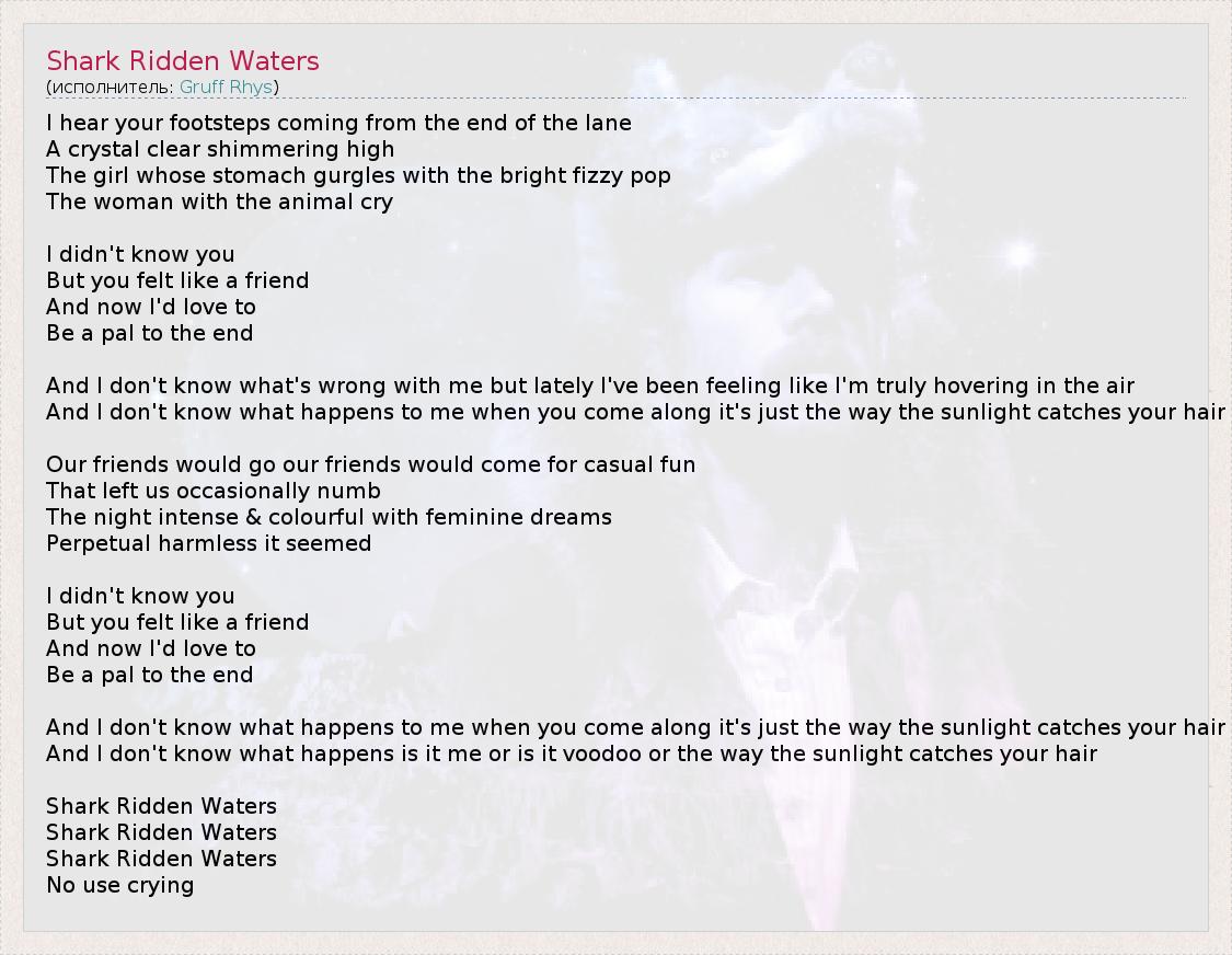 I hear your footsteps coming from the end of the lane A crystal clear shimmering high The girl whose stomach gurgles with the bright fizzy pop The woman with the animal cry I didn't know you But you felt like a friend And now I'd love to Be a pal to the end And I don't know what's wrong with me but lately I've been feeling like I'm truly hovering in the air And I don't know what happens to me when you come along it's just the way the sunlight catches your hair Our friends would go our friends would come for casual fun That left us occasionally numb The night intense & colourful with feminine dreams Perpetual harmless it seemed I didn't know you But you felt like a friend And now I'd love to Be a pal to the end And I don't know what happens to me when you come along it's just the way the sunlight catches your hair And I don't know what happens is it me or is it voodoo or the way the sunlight catches your hair Shark Ridden Waters Shark Ridden Waters Shark Ridden Waters No use crying