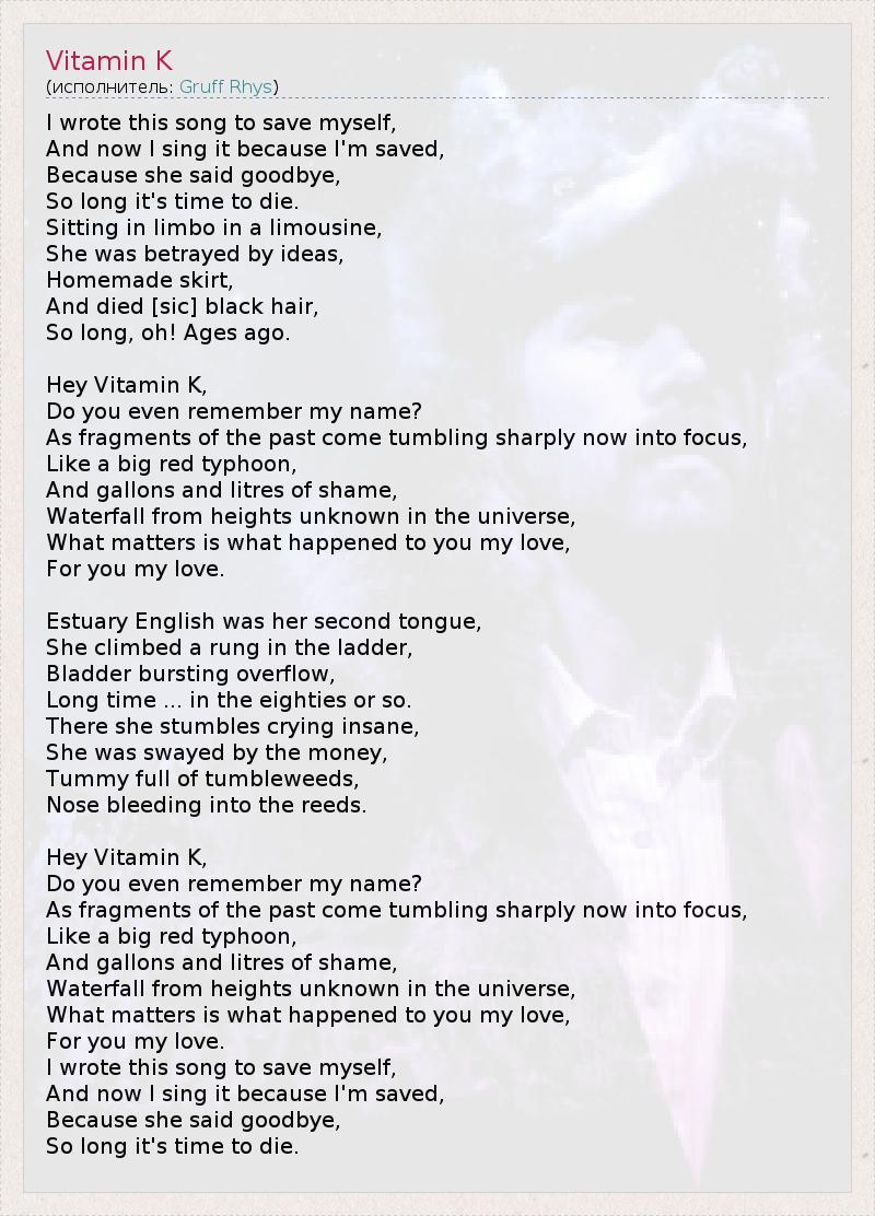 I wrote this song to save myself, And now I sing it because I'm saved, Because she said goodbye, So long it's time to die. Sitting in limbo in a limousine, She was betrayed by ideas, Homemade skirt, And died [sic] black hair, So long, oh! Ages ago. Hey Vitamin K, Do you even remember my name? As fragments of the past come tumbling sharply now into focus, Like a big red typhoon, And gallons and litres of shame, Waterfall from heights unknown in the universe, What matters is what happened to you my love, For you my love. Estuary English was her second tongue, She climbed a rung in the ladder, Bladder bursting overflow, Long time ... in the eighties or so. There she stumbles crying insane, She was swayed by the money, Tummy full of tumbleweeds, Nose bleeding into the reeds. Hey Vitamin K, Do you even remember my name? As fragments of the past come tumbling sharply now into focus, Like a big red typhoon, And gallons and litres of shame, Waterfall from heights unknown in the universe, What matters is what happened to you my love, For you my love. I wrote this song to save myself, And now I sing it because I'm saved, Because she said goodbye, So long it's time to die.