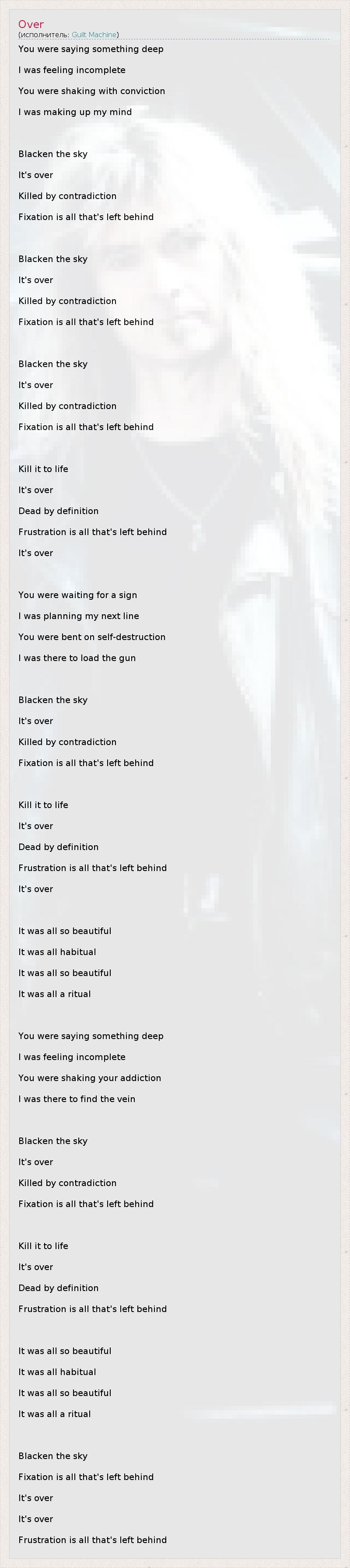 You were saying something deep I was feeling incomplete You were shaking with conviction I was making up my mind Blacken the sky It's over Killed by contradiction Fixation is all that's left behind Blacken the sky It's over Killed by contradiction Fixation is all that's left behind Blacken the sky It's over Killed by contradiction Fixation is all that's left behind Kill it to life It's over Dead by definition Frustration is all that's left behind It's over You were waiting for a sign I was planning my next line You were bent on self-destruction I was there to load the gun Blacken the sky It's over Killed by contradiction Fixation is all that's left behind Kill it to life It's over Dead by definition Frustration is all that's left behind It's over It was all so beautiful It was all habitual It was all so beautiful It was all a ritual You were saying something deep I was feeling incomplete You were shaking your addiction I was there to find the vein Blacken the sky It's over Killed by contradiction Fixation is all that's left behind Kill it to life It's over Dead by definition Frustration is all that's left behind It was all so beautiful It was all habitual It was all so beautiful It was all a ritual Blacken the sky Fixation is all that's left behind It's over It's over Frustration is all that's left behind