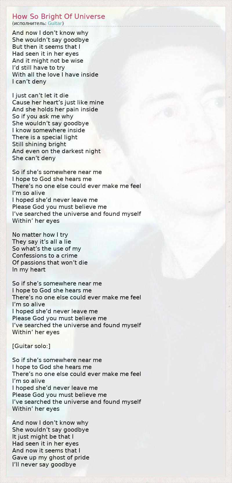 Теперь я не знаю, почему Она не сказала "Прощай!". Но мне кажется, Что я заметил это в ее глазах. И, возможно, это глупо, Но я все же еще должен попробовать, Со всей той любовью, что есть во мне, Я не могу от этого отказаться.... Я просто не могу позволить чувству умереть, Потому что ее сердце похоже на моё, И она не показывает свою боль. Поэтому, если вы спросите меня, почему Она не сказала "Прощай!" - Я знаю в глубине души, Что в ней есть особый свет, Сияющий ярко, как прежде, Даже в самую темную ночь, И она не может этого отрицать.... Если она где-то рядом со мной, Я надеюсь на Бога, что она меня слышит. Не существует больше никого, кто пробуждал бы во мне такие чувства, Я чувствую себя таким живым, Я надеялся, чтоона никогда не оставит меня... Пожалуйста, Боже, поверь мне! Я обыскал всю вселенную и нашел себя В ее глазах… Как бы я ни старалась, Говорят, что все это ложь. Тогда какой же мне смысл Раскаиваться в ошибках, совершенных Из-за страсти, которая не умрет В моем сердце... Если она где-то рядом со мной, Я надеюсь на Бога, что она меня слышит. Не существует больше никого, кто пробуждал бы во мне такие чувства, Я чувствую себя таким живым, Я надеялся, чтоона никогда не оставит меня... Пожалуйста, Боже, поверь мне! Я обыскал всю вселенную и нашел себя В ее глазах… [Cоло на гитаре:] Если она где-то рядом со мной, Я надеюсь на Бога, что она меня слышит. Не существует больше никого, кто пробуждал бы во мне такие чувства, Я чувствую себя таким живым, Я надеялся, чтоона никогда не оставит меня... Пожалуйста, Боже, поверь мне! Я обыскал всю вселенную и нашел себя В ее глазах… И теперь я не знаю, почему Она не скажет "Прощай!" Должно быть, Я видел это в ее глазах. И теперь, мне кажется, что я Прогнал свой призрак гордости, И уже никогда не скажу "Прощай!"
