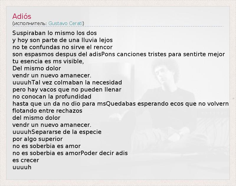 Это интересно:Gustavo Adrián Cerati Clark - Густаво Серати (родился в Буэнос-Айресе, 11 августа 1959 года). Аргентинский певец, композитор и гитарист. В 80-90-ые годы входил в состав известной аргентинской рок-группы Soda Stereo, вместе с Чарли Альберти (Charly Alberti) и Зета Босио (Zeta Bosio). После распада группы начал сольную карьеру с дебютным альбомом "Amor Amarillo" (в записи заглавного трека принял участие и Hector (Zeta)... продолжение