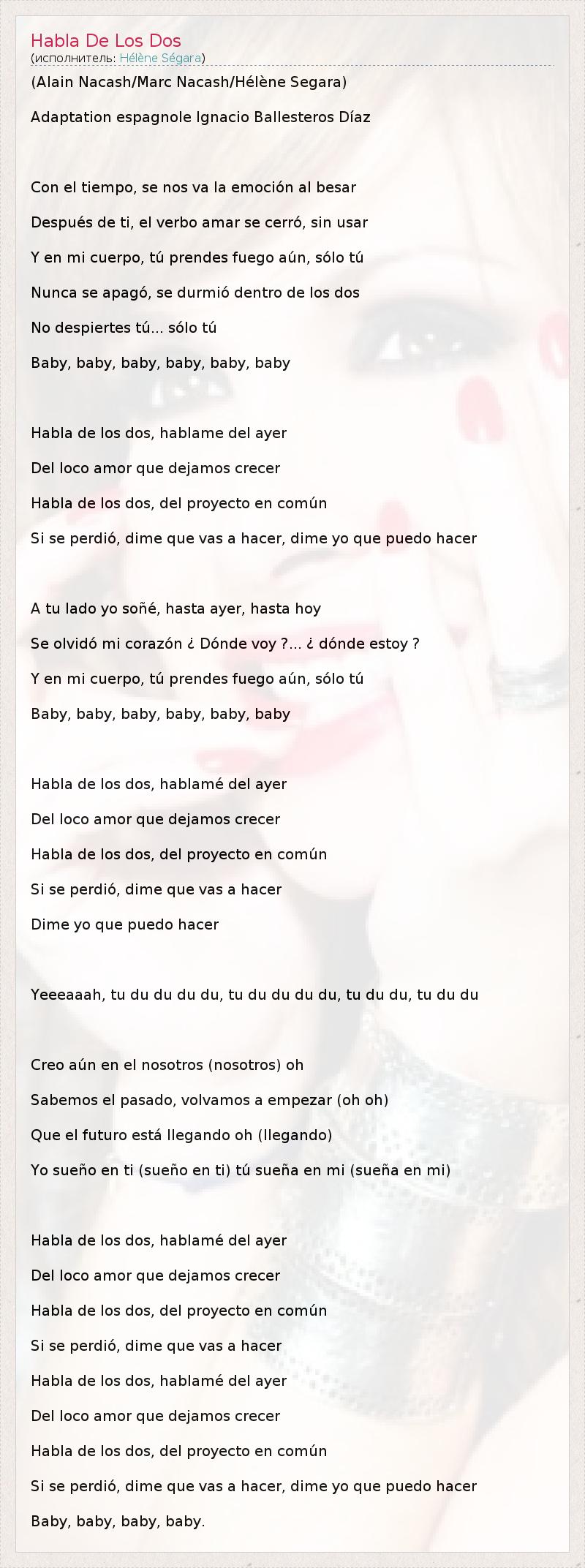 (Alain Nacash/Marc Nacash/Hélène Segara) Adaptation espagnole Ignacio Ballesteros Díaz Con el tiempo, se nos va la emoción al besar Después de ti, el verbo amar se cerró, sin usar Y en mi cuerpo, tú prendes fuego aún, sólo tú Nunca se apagó, se durmió dentro de los dos No despiertes tú... sólo tú Baby, baby, baby, baby, baby, baby Habla de los dos, hablame del ayer Del loco amor que dejamos crecer Habla de los dos, del proyecto en común Si se perdió, dime que vas a hacer, dime yo que puedo hacer A tu lado yo soñé, hasta ayer, hasta hoy Se olvidó mi corazón ¿ Dónde voy ?... ¿ dónde estoy ? Y en mi cuerpo, tú prendes fuego aún, sólo tú Baby, baby, baby, baby, baby, baby Habla de los dos, hablamé del ayer Del loco amor que dejamos crecer Habla de los dos, del proyecto en común Si se perdió, dime que vas a hacer Dime yo que puedo hacer Yeeeaaah, tu du du du du, tu du du du du, tu du du, tu du du Creo aún en el nosotros (nosotros) oh Sabemos el pasado, volvamos a empezar (oh oh) Que el futuro está llegando oh (llegando) Yo sueño en ti (sueño en ti) tú sueña en mi (sueña en mi) Habla de los dos, hablamé del ayer Del loco amor que dejamos crecer Habla de los dos, del proyecto en común Si se perdió, dime que vas a hacer Habla de los dos, hablamé del ayer Del loco amor que dejamos crecer Habla de los dos, del proyecto en común Si se perdió, dime que vas a hacer, dime yo que puedo hacer Baby, baby, baby, baby.