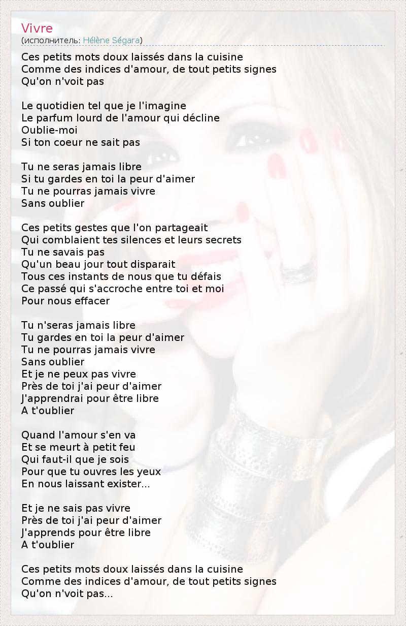Эти нежные записочки, оставленные в кухне, Как признаки любви, крошечные знаки, Которые мы не видим Повседневность, такая, какой я её себе представляю, Тяжёлый аромат ослабевающей любви, Забудь меня, Если твоё сердце не знает Ты никогда не будешь свободным, Если ты сохранишь в себе страх любить Ты никогда не сможешь жить, Не забывая Эти мелкие жесты, которые мы разделяли, Которые заполняли твоё молчание и его тайны Ты не знал, Что в один прекрасный день всё исчезает Все эти наши мгновения, которые ты разрушаешь, Это прошлое, которое задерживается между тобой и мной, Чтобы нас уничтожить Ты никогда не будешь свободным, Ты хранишь в себе страх любить Ты никогда не сможешь жить, Не забывая. И я не могу жить, Рядом с тобой я боюсь любить, Чтобы быть свободной, я научусь Забывать тебя Когда любовь уходит И медленно угасает, Кем я должна быть, Чтобы ты открыл глаза, Позволяя нам жить… И я не умею жить, Рядом с тобой я боюсь любить, Чтобы быть свободной, я учусь Забывать тебя Эти нежные записочки, оставленные в кухне, Как признаки любви, крошечные знаки, Которые мы не видим...