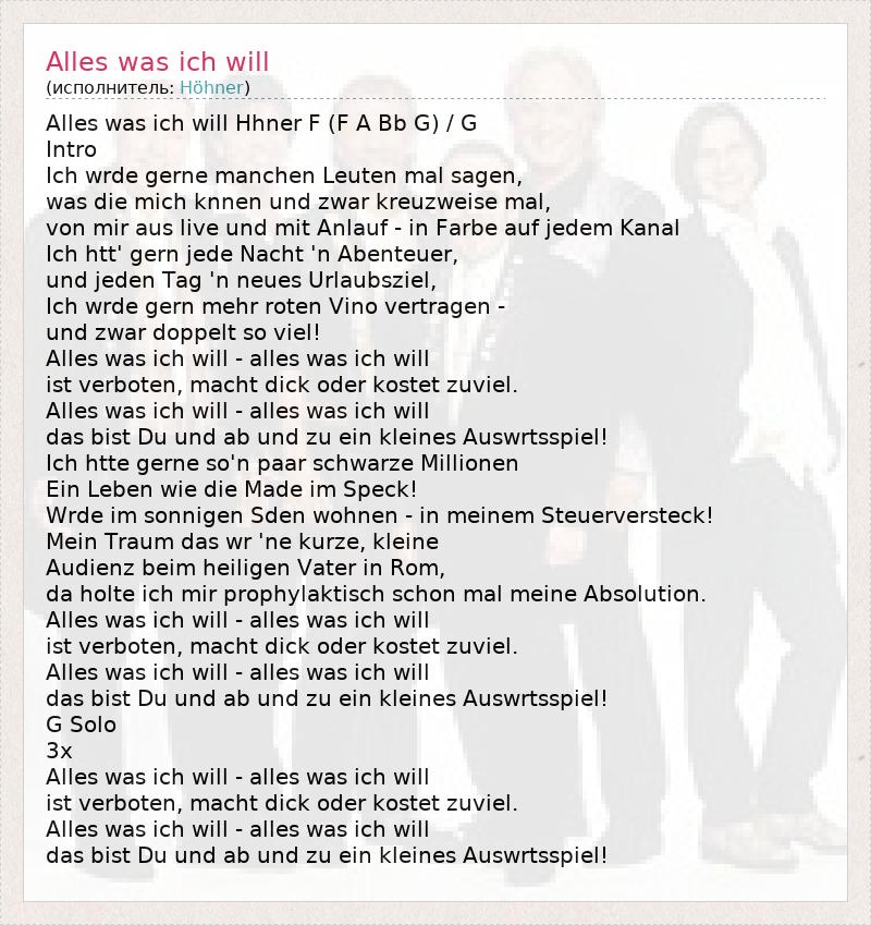 Alles was ich will Hhner F (F A Bb G) / G Intro Ich wrde gerne manchen Leuten mal sagen, was die mich knnen und zwar kreuzweise mal, von mir aus live und mit Anlauf - in Farbe auf jedem Kanal Ich htt' gern jede Nacht 'n Abenteuer, und jeden Tag 'n neues Urlaubsziel, Ich wrde gern mehr roten Vino vertragen - und zwar doppelt so viel! Alles was ich will - alles was ich will ist verboten, macht dick oder kostet zuviel. Alles was ich will - alles was ich will das bist Du und ab und zu ein kleines Auswrtsspiel! Ich htte gerne so'n paar schwarze Millionen Ein Leben wie die Made im Speck! Wrde im sonnigen Sden wohnen - in meinem Steuerversteck! Mein Traum das wr 'ne kurze, kleine Audienz beim heiligen Vater in Rom, da holte ich mir prophylaktisch schon mal meine Absolution. Alles was ich will - alles was ich will ist verboten, macht dick oder kostet zuviel. Alles was ich will - alles was ich will das bist Du und ab und zu ein kleines Auswrtsspiel! G Solo 3x Alles was ich will - alles was ich will ist verboten, macht dick oder kostet zuviel. Alles was ich will - alles was ich will das bist Du und ab und zu ein kleines Auswrtsspiel!