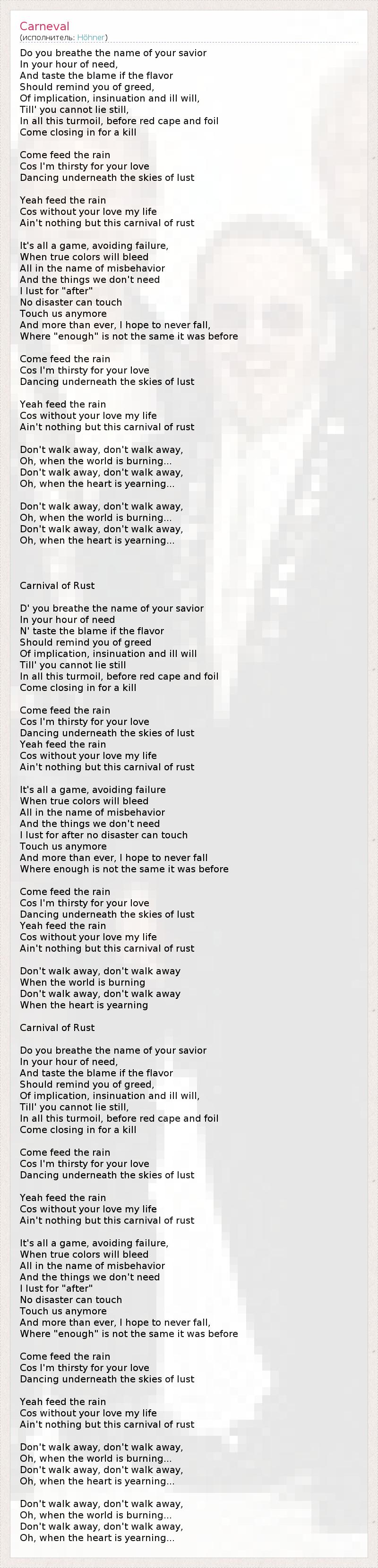 Do you breathe the name of your savior In your hour of need, And taste the blame if the flavor Should remind you of greed, Of implication, insinuation and ill will, Till' you cannot lie still, In all this turmoil, before red cape and foil Come closing in for a kill Come feed the rain Cos I'm thirsty for your love Dancing underneath the skies of lust Yeah feed the rain Cos without your love my life Ain't nothing but this carnival of rust It's all a game, avoiding failure, When true colors will bleed All in the name of misbehavior And the things we don't need I lust for "after" No disaster can touch Touch us anymore And more than ever, I hope to never fall, Where "enough" is not the same it was before Come feed the rain Cos I'm thirsty for your love Dancing underneath the skies of lust Yeah feed the rain Cos without your love my life Ain't nothing but this carnival of rust Don't walk away, don't walk away, Oh, when the world is burning... Don't walk away, don't walk away, Oh, when the heart is yearning... Don't walk away, don't walk away, Oh, when the world is burning... Don't walk away, don't walk away, Oh, when the heart is yearning... Carnival of Rust D' you breathe the name of your savior In your hour of need N' taste the blame if the flavor Should remind you of greed Of implication, insinuation and ill will Till' you cannot lie still In all this turmoil, before red cape and foil Come closing in for a kill Come feed the rain Cos I'm thirsty for your love Dancing underneath the skies of lust Yeah feed the rain Cos without your love my life Ain't nothing but this carnival of rust It's all a game, avoiding failure When true colors will bleed All in the name of misbehavior And the things we don't need I lust for after no disaster can touch Touch us anymore And more than ever, I hope to never fall Where enough is not the same it was before Come feed the rain Cos I'm thirsty for your love Dancing underneath the skies of lust Yeah feed the rain Cos without your love my life Ain't nothing but this carnival of rust Don't walk away, don't walk away When the world is burning Don't walk away, don't walk away When the heart is yearning Carnival of Rust Do you breathe the name of your savior In your hour of need, And taste the blame if the flavor Should remind you of greed, Of implication, insinuation and ill will, Till' you cannot lie still, In all this turmoil, before red cape and foil Come closing in for a kill Come feed the rain Cos I'm thirsty for your love Dancing underneath the skies of lust Yeah feed the rain Cos without your love my life Ain't nothing but this carnival of rust It's all a game, avoiding failure, When true colors will bleed All in the name of misbehavior And the things we don't need I lust for "after" No disaster can touch Touch us anymore And more than ever, I hope to never fall, Where "enough" is not the same it was before Come feed the rain Cos I'm thirsty for your love Dancing underneath the skies of lust Yeah feed the rain Cos without your love my life Ain't nothing but this carnival of rust Don't walk away, don't walk away, Oh, when the world is burning... Don't walk away, don't walk away, Oh, when the heart is yearning... Don't walk away, don't walk away, Oh, when the world is burning... Don't walk away, don't walk away, Oh, when the heart is yearning...