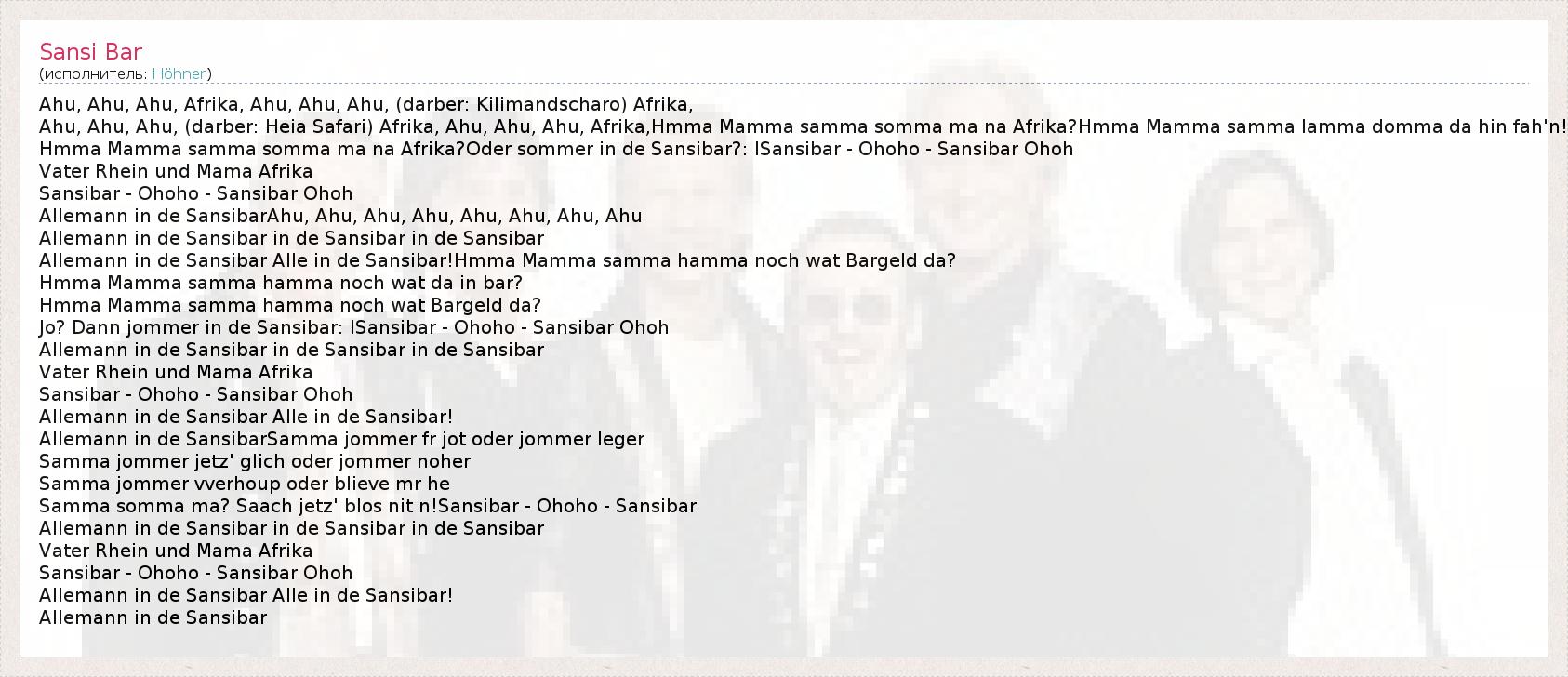 Ahu, Ahu, Ahu, Afrika, Ahu, Ahu, Ahu, (darber: Kilimandscharo) Afrika, Ahu, Ahu, Ahu, (darber: Heia Safari) Afrika, Ahu, Ahu, Ahu, Afrika,Hmma Mamma samma somma ma na Afrika?Hmma Mamma samma lamma domma da hin fah'n! Hmma Mamma samma somma ma na Afrika?Oder sommer in de Sansibar?: ISansibar - Ohoho - Sansibar Ohoh Vater Rhein und Mama Afrika Sansibar - Ohoho - Sansibar Ohoh Allemann in de SansibarAhu, Ahu, Ahu, Ahu, Ahu, Ahu, Ahu, Ahu Allemann in de Sansibar in de Sansibar in de Sansibar Allemann in de Sansibar Alle in de Sansibar!Hmma Mamma samma hamma noch wat Bargeld da? Hmma Mamma samma hamma noch wat da in bar? Hmma Mamma samma hamma noch wat Bargeld da? Jo? Dann jommer in de Sansibar: ISansibar - Ohoho - Sansibar Ohoh Allemann in de Sansibar in de Sansibar in de Sansibar Vater Rhein und Mama Afrika Sansibar - Ohoho - Sansibar Ohoh Allemann in de Sansibar Alle in de Sansibar! Allemann in de SansibarSamma jommer fr jot oder jommer leger Samma jommer jetz' glich oder jommer noher Samma jommer vverhoup oder blieve mr he Samma somma ma? Saach jetz' blos nit n!Sansibar - Ohoho - Sansibar Allemann in de Sansibar in de Sansibar in de Sansibar Vater Rhein und Mama Afrika Sansibar - Ohoho - Sansibar Ohoh Allemann in de Sansibar Alle in de Sansibar! Allemann in de Sansibar