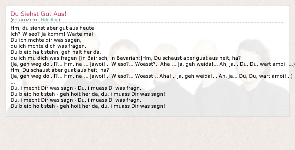 Hm, du siehst aber gut aus heute! Ich? Wiseo? Ja komm! Warte mal! Du ich mchte dir was sagen, du ich mchte dich was fragen. Du bleib halt stehn, geh halt her da, du ich mu dich was fragen![in Bairisch, in Bavarian:]Hm, Du schaust aber guat aus heit, ha? (Ja, geh weg do.. I?... Hm, na!... Jawoi!... Wieso?... Woasst?.. Aha!... Ja, geh weida!... Ah, ja... Du, Du, wart amoi! ...) Hm, Du schaust aber guat aus heit, ha? (Ja, geh weg do.. I?... Hm, na!... Jawoi!... Wieso?... Woasst!.. Aha!... Ja, geh weida!... Ah, ja... Du, Du, wart amoi!...) ... Du, i mecht Dir was sagn - Du, i muass Di was fragn, Du bleib hoit steh - geh hoit her da, du, i muass Dir was sagn! Du, i mecht Dir was sagn - Du, i muass Di was fragn, Du bleib hoit steh - geh hoit her da, du, i muass Dir was sagn!