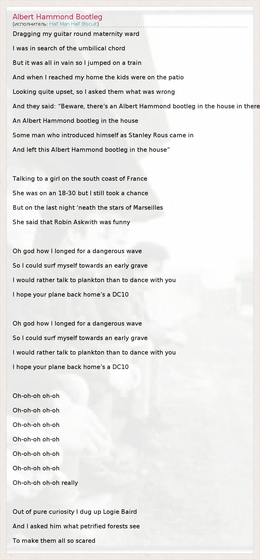 Dragging my guitar round maternity ward I was in search of the umbilical chord But it was all in vain so I jumped on a train And when I reached my home the kids were on the patio Looking quite upset, so I asked them what was wrong And they said: “Beware, there’s an Albert Hammond bootleg in the house in there An Albert Hammond bootleg in the house Some man who introduced himself as Stanley Rous came in And left this Albert Hammond bootleg in the house” Talking to a girl on the south coast of France She was on an 18-30 but I still took a chance But on the last night ‘neath the stars of Marseilles She said that Robin Askwith was funny Oh god how I longed for a dangerous wave So I could surf myself towards an early grave I would rather talk to plankton than to dance with you I hope your plane back home’s a DC10 Oh god how I longed for a dangerous wave So I could surf myself towards an early grave I would rather talk to plankton than to dance with you I hope your plane back home’s a DC10 Oh-oh-oh oh-oh Oh-oh-oh oh-oh Oh-oh-oh oh-oh Oh-oh-oh oh-oh Oh-oh-oh oh-oh Oh-oh-oh oh-oh Oh-oh-oh oh-oh really Out of pure curiosity I dug up Logie Baird And I asked him what petrified forests see To make them all so scared