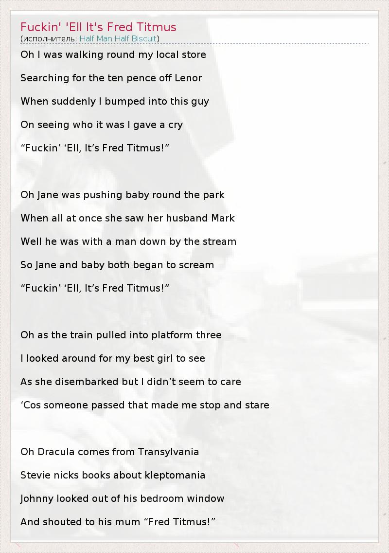 Oh I was walking round my local store Searching for the ten pence off Lenor When suddenly I bumped into this guy On seeing who it was I gave a cry “Fuckin’ ‘Ell, It’s Fred Titmus!” Oh Jane was pushing baby round the park When all at once she saw her husband Mark Well he was with a man down by the stream So Jane and baby both began to scream “Fuckin’ ‘Ell, It’s Fred Titmus!” Oh as the train pulled into platform three I looked around for my best girl to see As she disembarked but I didn’t seem to care ‘Cos someone passed that made me stop and stare Oh Dracula comes from Transylvania Stevie nicks books about kleptomania Johnny looked out of his bedroom window And shouted to his mum “Fred Titmus!”