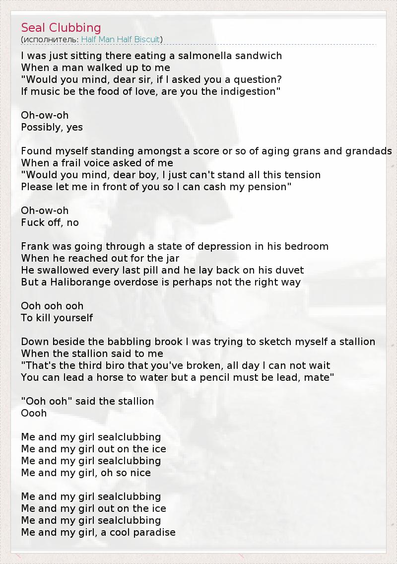 I was just sitting there eating a salmonella sandwich When a man walked up to me "Would you mind, dear sir, if I asked you a question? If music be the food of love, are you the indigestion" Oh-ow-oh Possibly, yes Found myself standing amongst a score or so of aging grans and grandads When a frail voice asked of me "Would you mind, dear boy, I just can't stand all this tension Please let me in front of you so I can cash my pension" Oh-ow-oh Fuck off, no Frank was going through a state of depression in his bedroom When he reached out for the jar He swallowed every last pill and he lay back on his duvet But a Haliborange overdose is perhaps not the right way Ooh ooh ooh To kill yourself Down beside the babbling brook I was trying to sketch myself a stallion When the stallion said to me "That's the third biro that you've broken, all day I can not wait You can lead a horse to water but a pencil must be lead, mate" "Ooh ooh" said the stallion Oooh Me and my girl sealclubbing Me and my girl out on the ice Me and my girl sealclubbing Me and my girl, oh so nice Me and my girl sealclubbing Me and my girl out on the ice Me and my girl sealclubbing Me and my girl, a cool paradise