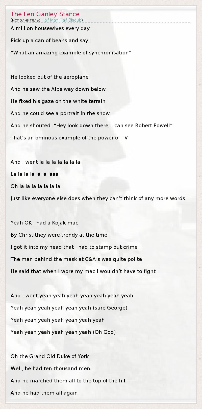 A million housewives every day Pick up a can of beans and say: “What an amazing example of synchronisation” He looked out of the aeroplane And he saw the Alps way down below He fixed his gaze on the white terrain And he could see a portrait in the snow And he shouted: “Hey look down there, I can see Robert Powell” That’s an ominous example of the power of TV And I went la la la la la la la La la la la la la laaa Oh la la la la la la la Just like everyone else does when they can’t think of any more words Yeah OK I had a Kojak mac By Christ they were trendy at the time I got it into my head that I had to stamp out crime The man behind the mask at C&A’s was quite polite He said that when I wore my mac I wouldn’t have to fight And I went yeah yeah yeah yeah yeah yeah yeah Yeah yeah yeah yeah yeah yeah (sure George) Yeah yeah yeah yeah yeah yeah yeah Yeah yeah yeah yeah yeah yeah (Oh God) Oh the Grand Old Duke of York Well, he had ten thousand men And he marched them all to the top of the hill And he had them all again