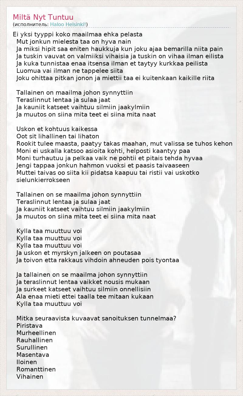 А как ты думаешь, о чем песня "Miltä Nyt Tuntuu" ?