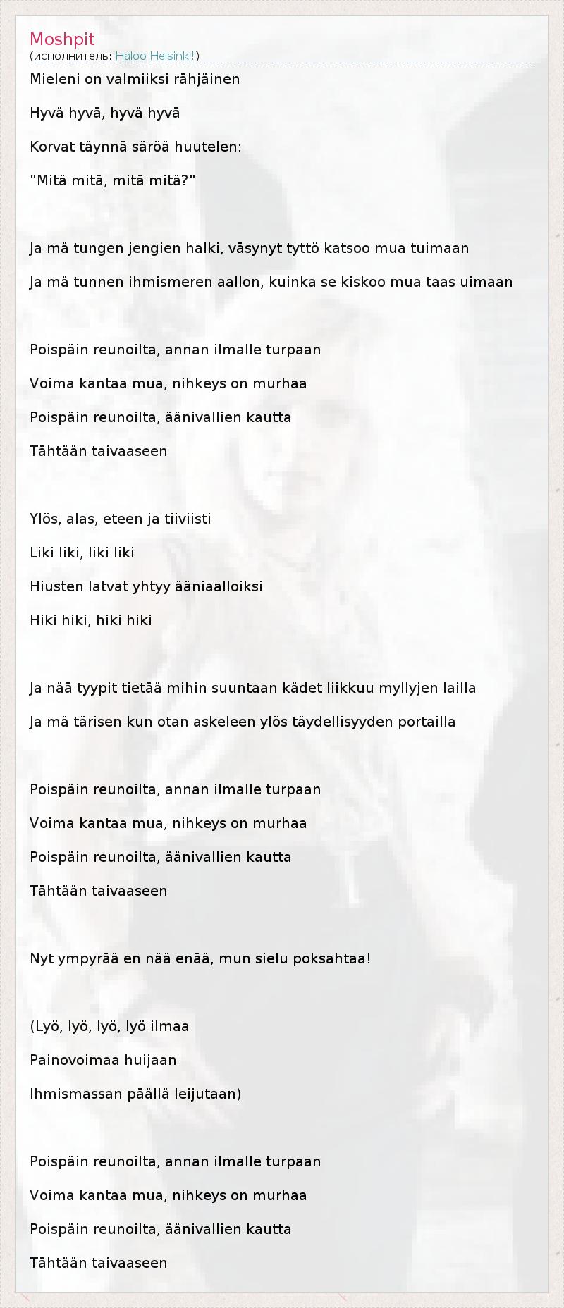 Mieleni on valmiiksi rähjäinen Hyvä hyvä, hyvä hyvä Korvat täynnä säröä huutelen: "Mitä mitä, mitä mitä?" Ja mä tungen jengien halki, väsynyt tyttö katsoo mua tuimaan Ja mä tunnen ihmismeren aallon, kuinka se kiskoo mua taas uimaan Poispäin reunoilta, annan ilmalle turpaan Voima kantaa mua, nihkeys on murhaa Poispäin reunoilta, äänivallien kautta Tähtään taivaaseen Ylös, alas, eteen ja tiiviisti Liki liki, liki liki Hiusten latvat yhtyy ääniaalloiksi Hiki hiki, hiki hiki Ja nää tyypit tietää mihin suuntaan kädet liikkuu myllyjen lailla Ja mä tärisen kun otan askeleen ylös täydellisyyden portailla Poispäin reunoilta, annan ilmalle turpaan Voima kantaa mua, nihkeys on murhaa Poispäin reunoilta, äänivallien kautta Tähtään taivaaseen Nyt ympyrää en nää enää, mun sielu poksahtaa! (Lyö, lyö, lyö, lyö ilmaa Painovoimaa huijaan Ihmismassan päällä leijutaan) Poispäin reunoilta, annan ilmalle turpaan Voima kantaa mua, nihkeys on murhaa Poispäin reunoilta, äänivallien kautta Tähtään taivaaseen