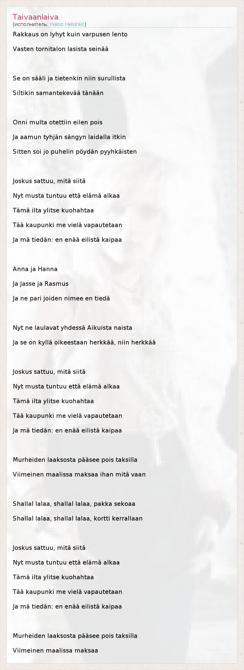 Это интересно:Здравствуйте, Хельсинки! - именно так переводится название этой группы. Можно и совсем по-молодёжному (как и поют участники группы) - Привет, Хельсинки!Состав - Elli (вокал и бас), Jere (гитара и поддержка вокала), Leo (гитара и поддержка вокала) и Jukka (барабаны). В 2009 году группа планирует включить обширные турне по Финляндии, представляя второй альбом levyttäminen. Условно релиз нового альбома планируется... продолжение