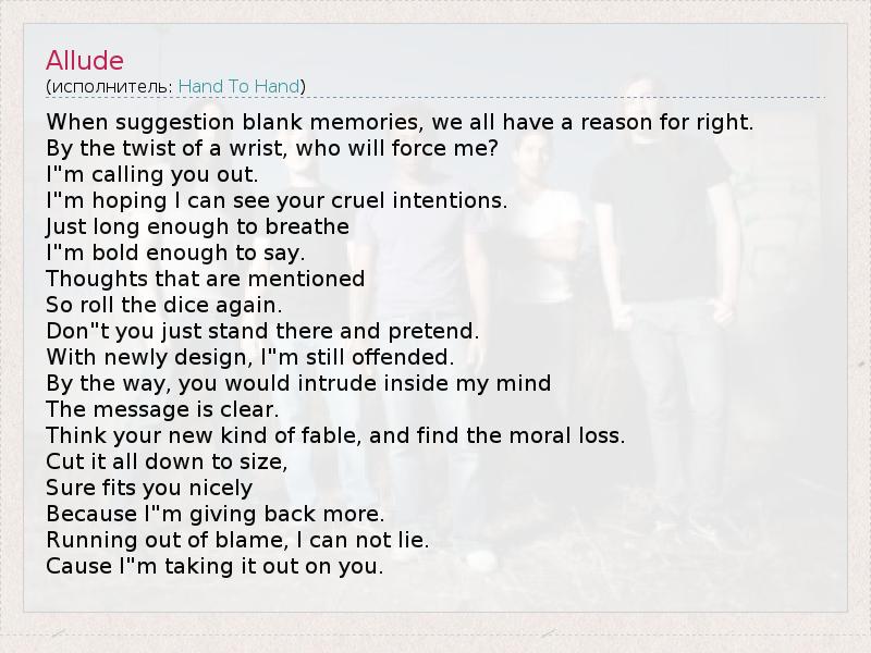 When suggestion blank memories, we all have a reason for right. By the twist of a wrist, who will force me? I"m calling you out. I"m hoping I can see your cruel intentions. Just long enough to breathe I"m bold enough to say. Thoughts that are mentioned So roll the dice again. Don"t you just stand there and pretend. With newly design, I"m still offended. By the way, you would intrude inside my mind The message is clear. Think your new kind of fable, and find the moral loss. Cut it all down to size, Sure fits you nicely Because I"m giving back more. Running out of blame, I can not lie. Cause I"m taking it out on you.