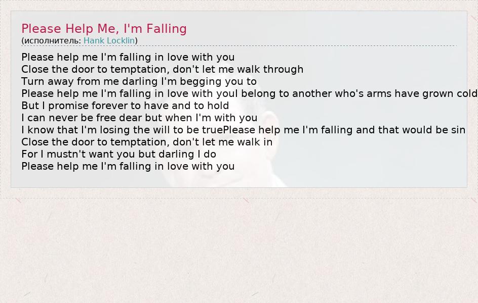 Please help me I'm falling in love with you Close the door to temptation, don't let me walk through Turn away from me darling I'm begging you to Please help me I'm falling in love with youI belong to another who's arms have grown cold But I promise forever to have and to hold I can never be free dear but when I'm with you I know that I'm losing the will to be truePlease help me I'm falling and that would be sin Close the door to temptation, don't let me walk in For I mustn't want you but darling I do Please help me I'm falling in love with you
