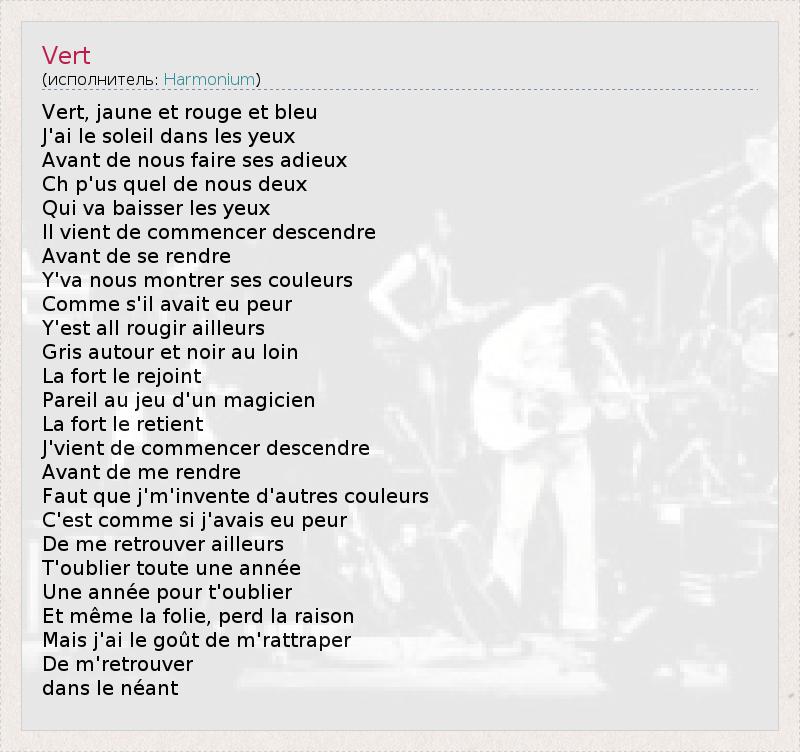 Vert, jaune et rouge et bleu J'ai le soleil dans les yeux Avant de nous faire ses adieux Ch p'us quel de nous deux Qui va baisser les yeux Il vient de commencer descendre Avant de se rendre Y'va nous montrer ses couleurs Comme s'il avait eu peur Y'est all rougir ailleurs Gris autour et noir au loin La fort le rejoint Pareil au jeu d'un magicien La fort le retient J'vient de commencer descendre Avant de me rendre Faut que j'm'invente d'autres couleurs C'est comme si j'avais eu peur De me retrouver ailleurs T'oublier toute une année Une année pour t'oublier Et même la folie, perd la raison Mais j'ai le goût de m'rattraper De m'retrouver dans le néant