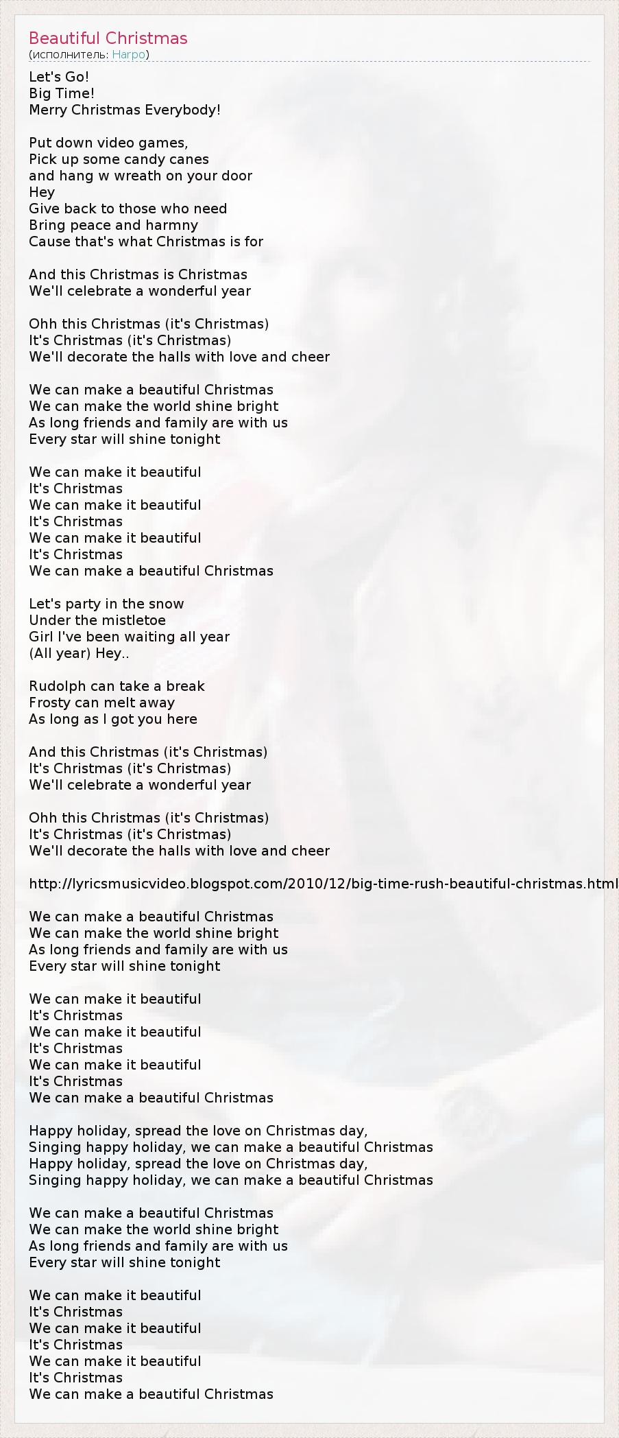 Let's Go! Big Time! Merry Christmas Everybody! Put down video games, Pick up some candy canes and hang w wreath on your door Hey Give back to those who need Bring peace and harmny Cause that's what Christmas is for And this Christmas is Christmas We'll celebrate a wonderful year Ohh this Christmas (it's Christmas) It's Christmas (it's Christmas) We'll decorate the halls with love and cheer We can make a beautiful Christmas We can make the world shine bright As long friends and family are with us Every star will shine tonight We can make it beautiful It's Christmas We can make it beautiful It's Christmas We can make it beautiful It's Christmas We can make a beautiful Christmas Let's party in the snow Under the mistletoe Girl I've been waiting all year (All year) Hey.. Rudolph can take a break Frosty can melt away As long as I got you here And this Christmas (it's Christmas) It's Christmas (it's Christmas) We'll celebrate a wonderful year Ohh this Christmas (it's Christmas) It's Christmas (it's Christmas) We'll decorate the halls with love and cheer http://lyricsmusicvideo.blogspot.com/2010/12/big-time-rush-beautiful-christmas.html We can make a beautiful Christmas We can make the world shine bright As long friends and family are with us Every star will shine tonight We can make it beautiful It's Christmas We can make it beautiful It's Christmas We can make it beautiful It's Christmas We can make a beautiful Christmas Happy holiday, spread the love on Christmas day, Singing happy holiday, we can make a beautiful Christmas Happy holiday, spread the love on Christmas day, Singing happy holiday, we can make a beautiful Christmas We can make a beautiful Christmas We can make the world shine bright As long friends and family are with us Every star will shine tonight We can make it beautiful It's Christmas We can make it beautiful It's Christmas We can make it beautiful It's Christmas We can make a beautiful Christmas