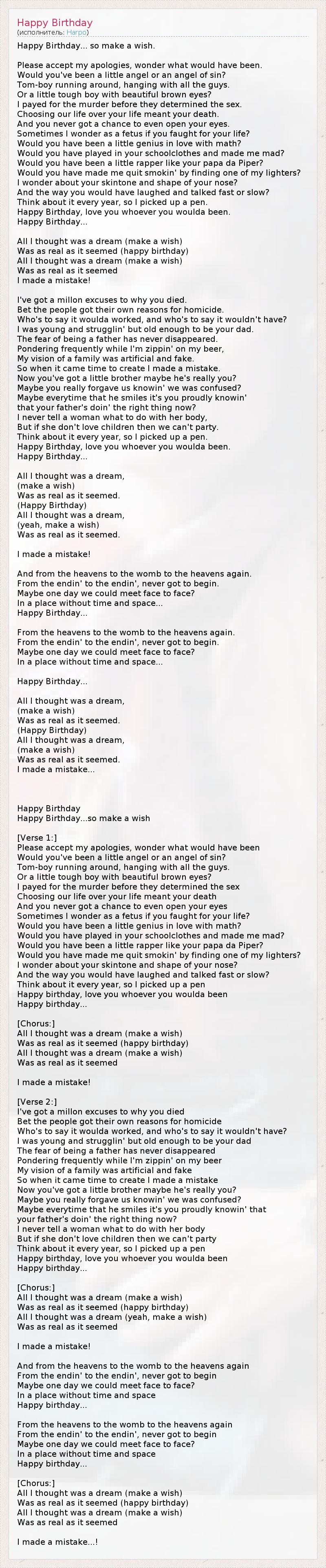 С Днём Рождения. Загадать желание самое время. Пожалуйста, прими мои извинения. Мне так интересно, кем бы ты был, Был бы ты ангелочком? или грешником жил? Был бы взбалмошным мальчишкой, веселившимся с друзьями? Или классным парнем с красивыми карими глазами? Я заплатил за убийство еще прежде, чем увидел тебя. Мы приговорили тебя к смерти, выбрав жизнь для себя. Ты не получил даже шанса взглянуть на этот мир. Иногда я задумываюсь: боролся ли ты за жизнь? Возможно, ты бы стал гением-математиком, оставившим след в истории, А, может, злил бы меня, играя допоздна на школьной территории. А вдруг ты бы стал маленьким рэпером, как твой папочка Пайпер? Или заставил бы меня бросить курить, одну из моих зажигалок спрятав. Я бы так хотел узнать, какой у тебя был тон кожи и форма носа? И как бы ты разговаривал и смеялся? – я задаюсь вопросом. И я думаю об этом каждый год. И вот, я беру ручку, пишу, хоть и приуныл. С Днём Рождения. Я люблю тебя, и не важно, кем бы ты был... С Днём Рождения... Всё, о чём я мечтала, мне только приснилось, (Загадать желание самое время) Но было так правдиво, жаль, не осуществилось. (С Днём Рождения) Я совершила ошибку... Я могу назвать тысячу оправданий твоей смерти, Ведь у каждого найдутся причины для убийства, поверьте. Кто-то скажет, что всё получилось бы, а кто-то скажет, что – нет? Я был молод, искал себя, но был вполне взрослым, чтобы ты появился на свет. Страх быть отцом меня так и не покинул. И я часто размышляю, сидя за кружкой пива, О том, что моё видение семьи было надуманным и зыбким. И вот, когда пришло время начинать, я допустил ошибку. Но теперь у тебя есть брат, возможно, он, и правда, – ты? Возможно, ты простил нас, узнав, что сожалеем мы. А вдруг, его улыбка – твоя улыбка гордости от понимания Того, что теперь твой отец делает всё правильно? Я никогда не говорю женщине, что ей делать с собой. Но если она не любит детей, мы не будем вдвоём. И я думаю об этом каждый год. И вот, я беру ручку, пишу, хоть и приуныл. С Днём Рождения. Я люблю тебя, и не важно, кем бы ты был... С Днём Рождения... Всё, о чём я мечтала, мне только приснилось, (Загадать желание самое время) Но было так правдиво, жаль, не осуществилось. (С Днём Рождения) Всё, о чём я мечтала, мне только приснилось, (Загадать желание самое время) Но было так правдиво, жаль, не осуществилось. Я совершила ошибку. С небес – в утробу матери – и на небеса обратно. С одного конца – на другой конец, и уже безвозвратно. Возможно, мы встретимся лицом к лицу однажды, Где время и пространство для людей уже не важно... С Днём Рождения... С небес – в утробу матери – и на небеса обратно. С одного конца – на другой конец, и уже безвозвратно. Возможно, мы встретимся лицом к лицу однажды, Где время и пространство для людей уже не важно... С Днём Рождения... Всё, о чём я мечтала, мне только приснилось, (Загадать желание самое время) Но было так правдиво, жаль, не осуществилось. (С Днём Рождения) Всё, о чём я мечтала, мне только приснилось, (Загадать желание самое время) Но было так правдиво, жаль, не осуществилось. Я совершила ошибку... С днём рождения! (перевод) С днём рождения! Загадай желание! [1-ый куплет:] Пожалуйста, прими мои извинения. Интересно, кем бы ты был, Маленьким ангелочком или грешником? Взбалмошным дворовым мальчишкой Или классным парнем с красивыми карими глазами? Я заплатил за убийство ещё прежде, чем узнал твой пол. Выбрав жиз