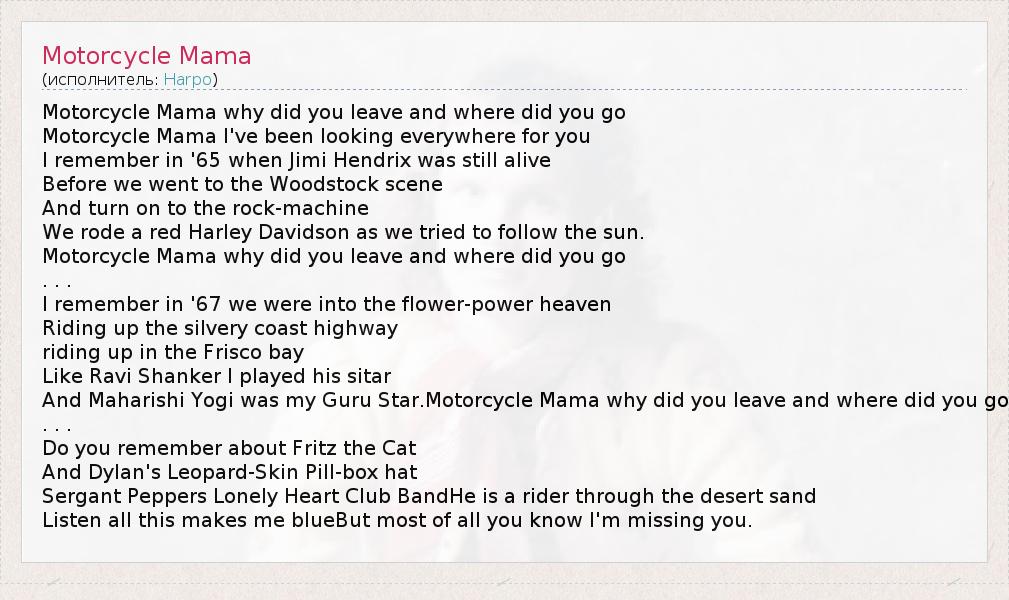 Motorcycle Mama why did you leave and where did you go Motorcycle Mama I've been looking everywhere for you I remember in '65 when Jimi Hendrix was still alive Before we went to the Woodstock scene And turn on to the rock-machine We rode a red Harley Davidson as we tried to follow the sun. Motorcycle Mama why did you leave and where did you go . . . I remember in '67 we were into the flower-power heaven Riding up the silvery coast highway riding up in the Frisco bay Like Ravi Shanker I played his sitar And Maharishi Yogi was my Guru Star.Motorcycle Mama why did you leave and where did you go . . . Do you remember about Fritz the Cat And Dylan's Leopard-Skin Pill-box hat Sergant Peppers Lonely Heart Club BandHe is a rider through the desert sand Listen all this makes me blueBut most of all you know I'm missing you.