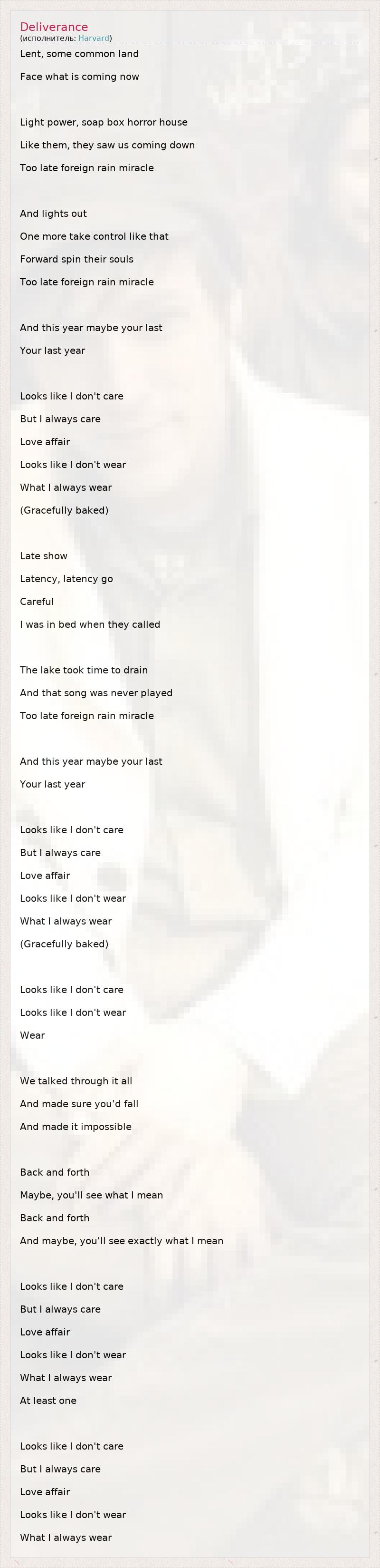 Lent, some common land Face what is coming now Light power, soap box horror house Like them, they saw us coming down Too late foreign rain miracle And lights out One more take control like that Forward spin their souls Too late foreign rain miracle And this year maybe your last Your last year Looks like I don't care But I always care Love affair Looks like I don't wear What I always wear (Gracefully baked) Late show Latency, latency go Careful I was in bed when they called The lake took time to drain And that song was never played Too late foreign rain miracle And this year maybe your last Your last year Looks like I don't care But I always care Love affair Looks like I don't wear What I always wear (Gracefully baked) Looks like I don't care Looks like I don't wear Wear We talked through it all And made sure you'd fall And made it impossible Back and forth Maybe, you'll see what I mean Back and forth And maybe, you'll see exactly what I mean Looks like I don't care But I always care Love affair Looks like I don't wear What I always wear At least one Looks like I don't care But I always care Love affair Looks like I don't wear What I always wear