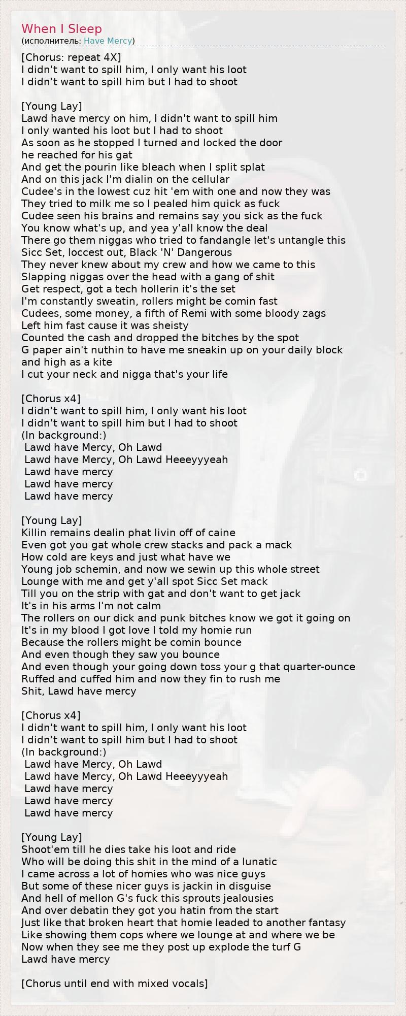 [Chorus: repeat 4X] I didn't want to spill him, I only want his loot I didn't want to spill him but I had to shoot [Young Lay] Lawd have mercy on him, I didn't want to spill him I only wanted his loot but I had to shoot As soon as he stopped I turned and locked the door he reached for his gat And get the pourin like bleach when I split splat And on this jack I'm dialin on the cellular Cudee's in the lowest cuz hit 'em with one and now they was They tried to milk me so I pealed him quick as fuck Cudee seen his brains and remains say you sick as the fuck You know what's up, and yea y'all know the deal There go them niggas who tried to fandangle let's untangle this Sicc Set, loccest out, Black 'N' Dangerous They never knew about my crew and how we came to this Slapping niggas over the head with a gang of shit Get respect, got a tech hollerin it's the set I'm constantly sweatin, rollers might be comin fast Cudees, some money, a fifth of Remi with some bloody zags Left him fast cause it was sheisty Counted the cash and dropped the bitches by the spot G paper ain't nuthin to have me sneakin up on your daily block and high as a kite I cut your neck and nigga that's your life [Chorus x4] I didn't want to spill him, I only want his loot I didn't want to spill him but I had to shoot (In background:) Lawd have Mercy, Oh Lawd Lawd have Mercy, Oh Lawd Heeeyyyeah Lawd have mercy Lawd have mercy Lawd have mercy [Young Lay] Killin remains dealin phat livin off of caine Even got you gat whole crew stacks and pack a mack How cold are keys and just what have we Young job schemin, and now we sewin up this whole street Lounge with me and get y'all spot Sicc Set mack Till you on the strip with gat and don't want to get jack It's in his arms I'm not calm The rollers on our dick and punk bitches know we got it going on It's in my blood I got love I told my homie run Because the rollers might be comin bounce And even though they saw you bounce And even though your going down toss your g that quarter-ounce Ruffed and cuffed him and now they fin to rush me Shit, Lawd have mercy [Chorus x4] I didn't want to spill him, I only want his loot I didn't want to spill him but I had to shoot (In background:) Lawd have Mercy, Oh Lawd Lawd have Mercy, Oh Lawd Heeeyyyeah Lawd have mercy Lawd have mercy Lawd have mercy [Young Lay] Shoot'em till he dies take his loot and ride Who will be doing this shit in the mind of a lunatic I came across a lot of homies who was nice guys But some of these nicer guys is jackin in disguise And hell of mellon G's fuck this sprouts jealousies And over debatin they got you hatin from the start Just like that broken heart that homie leaded to another fantasy Like showing them cops where we lounge at and where we be Now when they see me they post up explode the turf G Lawd have mercy [Chorus until end with mixed vocals]