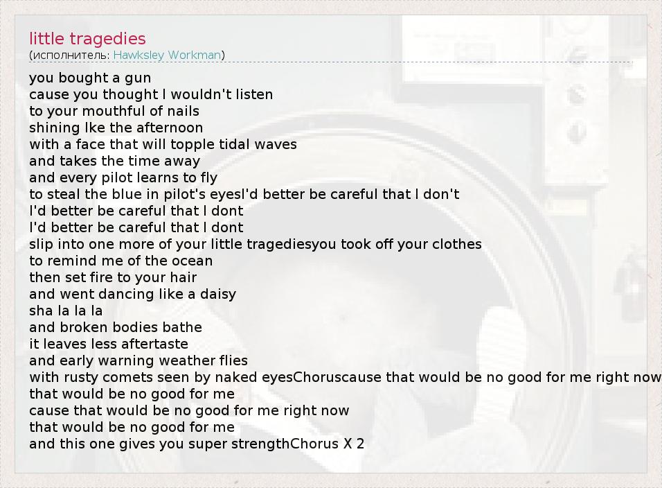 Это интересно:Ryan Corrigan (born March 4, 1975), better known by the stage name Hawksley Workman, is a Canadian rock singer-songwriter who has garnered critical acclaim for his quirky yet accessible blend of cabaret pop and glam rock. Workman has released eleven full length albums throughout his career. He is a multi-instrumentalist, playing guitar, drums, bass, keyboards and singing on his records and often switching between those instruments when playing live.Workman is a prolific artist, usually writing, recording, mastering and releasing entire albums in the span of a few weeks. He explains, "A lot of artists I know they get a year and a half away from a record they've just made it's... продолжение