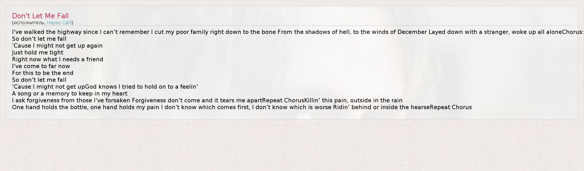 I've walked the highway since I can't remember I cut my poor family right down to the bone From the shadows of hell, to the winds of December Layed down with a stranger, woke up all aloneChorus: So don't let me fall 'Cause I might not get up again Just hold me tight Right now what I needs a friend I've come to far now For this to be the end So don't let me fall 'Cause I might not get upGod knows I tried to hold on to a feelin' A song or a memory to keep in my heart I ask forgiveness from those I've forsaken Forgiveness don't come and it tears me apartRepeat ChorusKillin' this pain, outside in the rain One hand holds the bottle, one hand holds my pain I don't know which comes first, I don't know which is worse Ridin' behind or inside the hearseRepeat Chorus