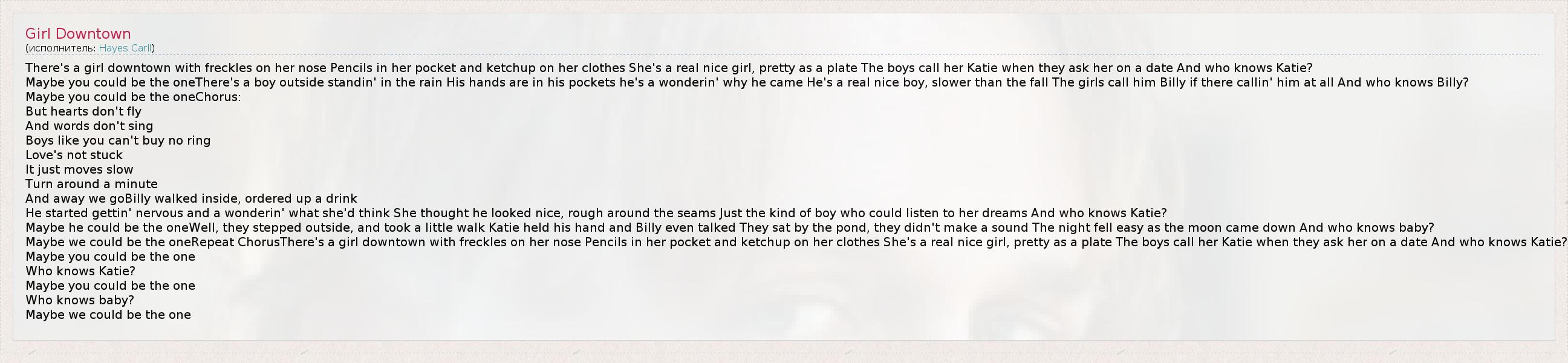 There's a girl downtown with freckles on her nose Pencils in her pocket and ketchup on her clothes She's a real nice girl, pretty as a plate The boys call her Katie when they ask her on a date And who knows Katie? Maybe you could be the oneThere's a boy outside standin' in the rain His hands are in his pockets he's a wonderin' why he came He's a real nice boy, slower than the fall The girls call him Billy if there callin' him at all And who knows Billy? Maybe you could be the oneChorus: But hearts don't fly And words don't sing Boys like you can't buy no ring Love's not stuck It just moves slow Turn around a minute And away we goBilly walked inside, ordered up a drink He started gettin' nervous and a wonderin' what she'd think She thought he looked nice, rough around the seams Just the kind of boy who could listen to her dreams And who knows Katie? Maybe he could be the oneWell, they stepped outside, and took a little walk Katie held his hand and Billy even talked They sat by the pond, they didn't make a sound The night fell easy as the moon came down And who knows baby? Maybe we could be the oneRepeat ChorusThere's a girl downtown with freckles on her nose Pencils in her pocket and ketchup on her clothes She's a real nice girl, pretty as a plate The boys call her Katie when they ask her on a date And who knows Katie? Maybe you could be the one Who knows Katie? Maybe you could be the one Who knows baby? Maybe we could be the one