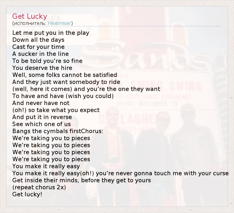 Let me put you in the play Down all the days Cast for your time A sucker in the line To be told you're so fine You deserve the hire Well, some folks cannot be satisfied And they just want somebody to ride (well, here it comes) and you're the one they want To have and have (wish you could) And never have not (oh!) so take what you expect And put it in reverse See which one of us Bangs the cymbals firstChorus: We're taking you to pieces We're taking you to pieces We're taking you to pieces We're taking you to pieces You make it really easy You make it really easy(oh!) you're never gonna touch me with your curse Get inside their minds, before they get to yours (repeat chorus 2x) Get lucky!
