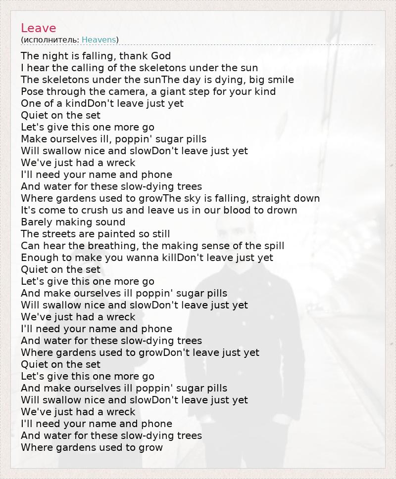 The night is falling, thank God I hear the calling of the skeletons under the sun The skeletons under the sunThe day is dying, big smile Pose through the camera, a giant step for your kind One of a kindDon't leave just yet Quiet on the set Let's give this one more go Make ourselves ill, poppin' sugar pills Will swallow nice and slowDon't leave just yet We've just had a wreck I'll need your name and phone And water for these slow-dying trees Where gardens used to growThe sky is falling, straight down It's come to crush us and leave us in our blood to drown Barely making sound The streets are painted so still Can hear the breathing, the making sense of the spill Enough to make you wanna killDon't leave just yet Quiet on the set Let's give this one more go And make ourselves ill poppin' sugar pills Will swallow nice and slowDon't leave just yet We've just had a wreck I'll need your name and phone And water for these slow-dying trees Where gardens used to growDon't leave just yet Quiet on the set Let's give this one more go And make ourselves ill poppin' sugar pills Will swallow nice and slowDon't leave just yet We've just had a wreck I'll need your name and phone And water for these slow-dying trees Where gardens used to grow