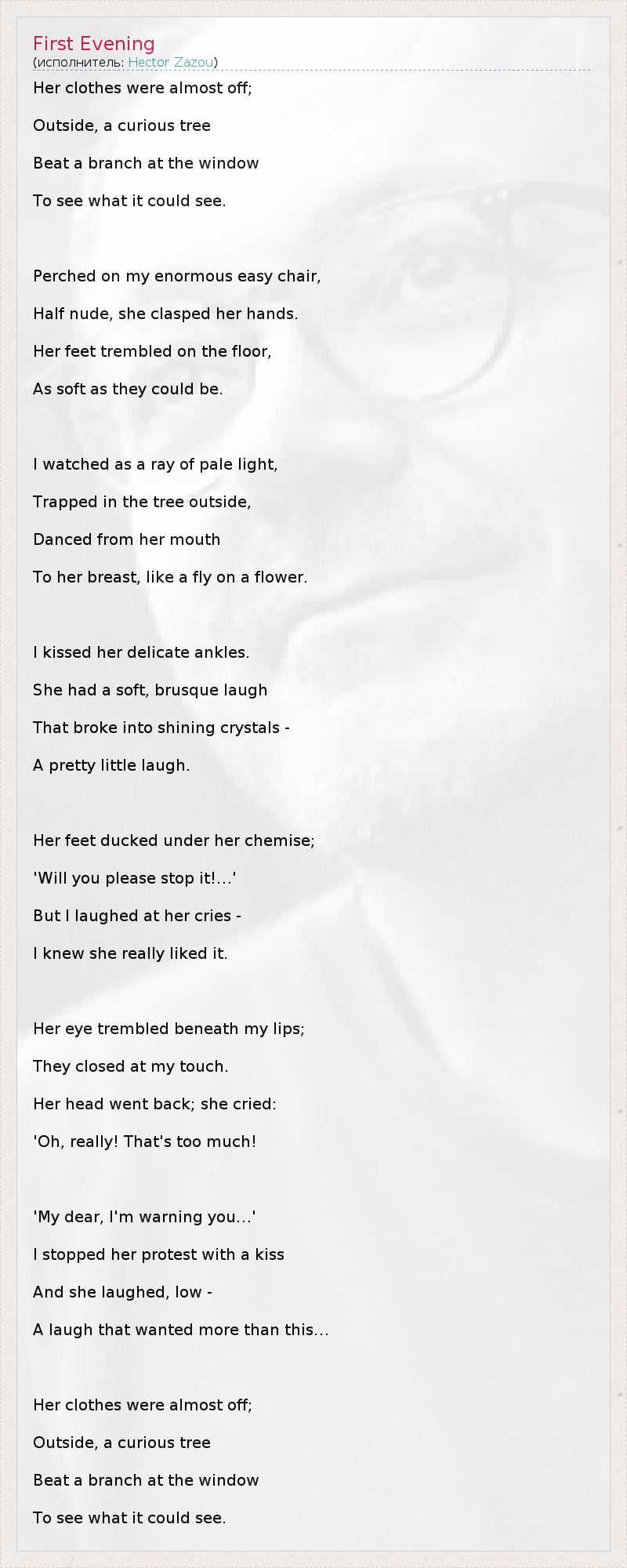 Her clothes were almost off; Outside, a curious tree Beat a branch at the window To see what it could see. Perched on my enormous easy chair, Half nude, she clasped her hands. Her feet trembled on the floor, As soft as they could be. I watched as a ray of pale light, Trapped in the tree outside, Danced from her mouth To her breast, like a fly on a flower. I kissed her delicate ankles. She had a soft, brusque laugh That broke into shining crystals - A pretty little laugh. Her feet ducked under her chemise; 'Will you please stop it!…' But I laughed at her cries - I knew she really liked it. Her eye trembled beneath my lips; They closed at my touch. Her head went back; she cried: 'Oh, really! That's too much! 'My dear, I'm warning you…' I stopped her protest with a kiss And she laughed, low - A laugh that wanted more than this… Her clothes were almost off; Outside, a curious tree Beat a branch at the window To see what it could see.
