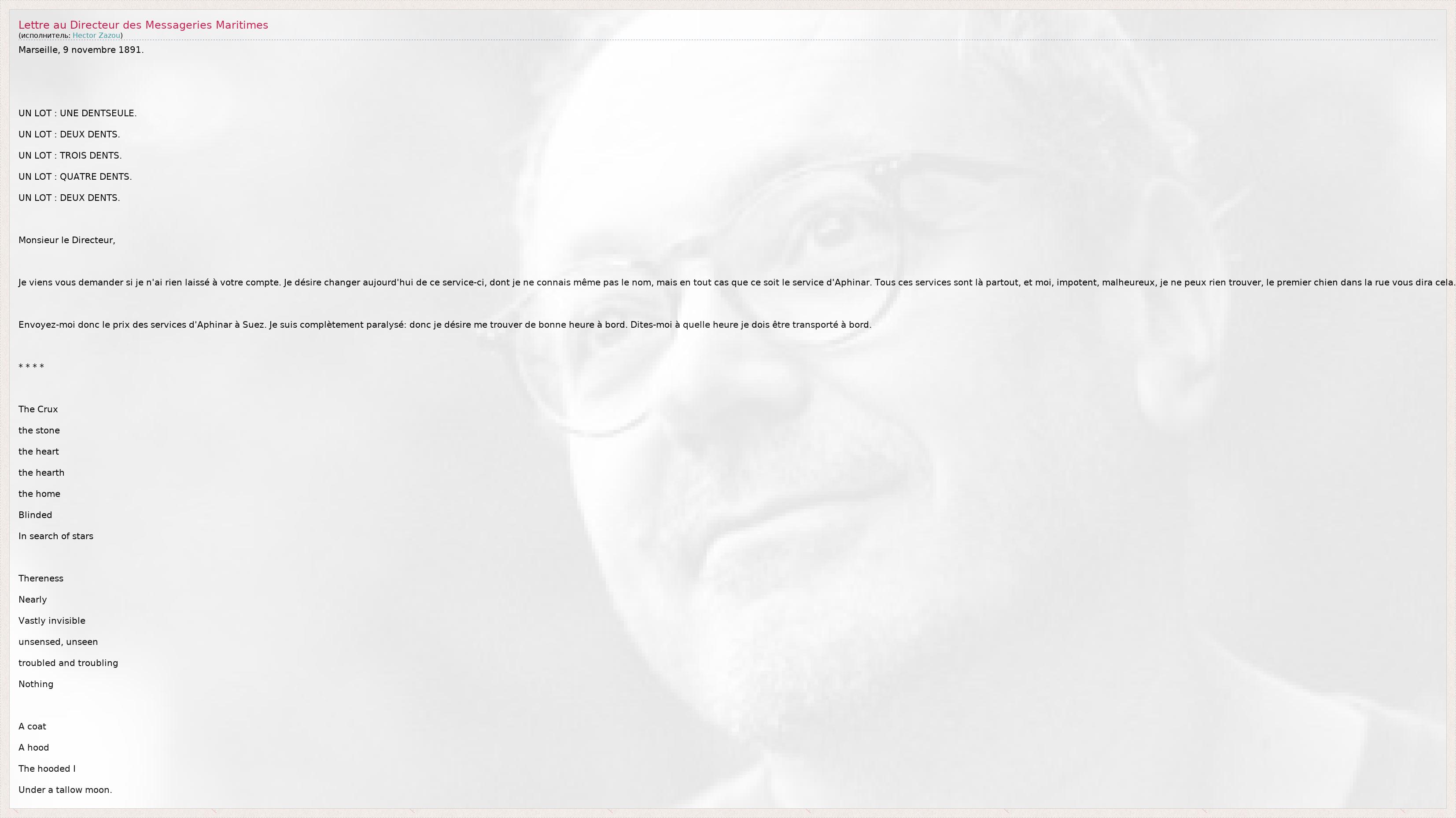 Marseille, 9 novembre 1891. UN LOT : UNE DENTSEULE. UN LOT : DEUX DENTS. UN LOT : TROIS DENTS. UN LOT : QUATRE DENTS. UN LOT : DEUX DENTS. Monsieur le Directeur, Je viens vous demander si je n'ai rien laissé à votre compte. Je désire changer aujourd'hui de ce service-ci, dont je ne connais même pas le nom, mais en tout cas que ce soit le service d'Aphinar. Tous ces services sont là partout, et moi, impotent, malheureux, je ne peux rien trouver, le premier chien dans la rue vous dira cela. Envoyez-moi donc le prix des services d'Aphinar à Suez. Je suis complètement paralysé: donc je désire me trouver de bonne heure à bord. Dites-moi à quelle heure je dois être transporté à bord. * * * * The Crux the stone the heart the hearth the home Blinded In search of stars Thereness Nearly Vastly invisible unsensed, unseen troubled and troubling Nothing A coat A hood The hooded I Under a tallow moon.