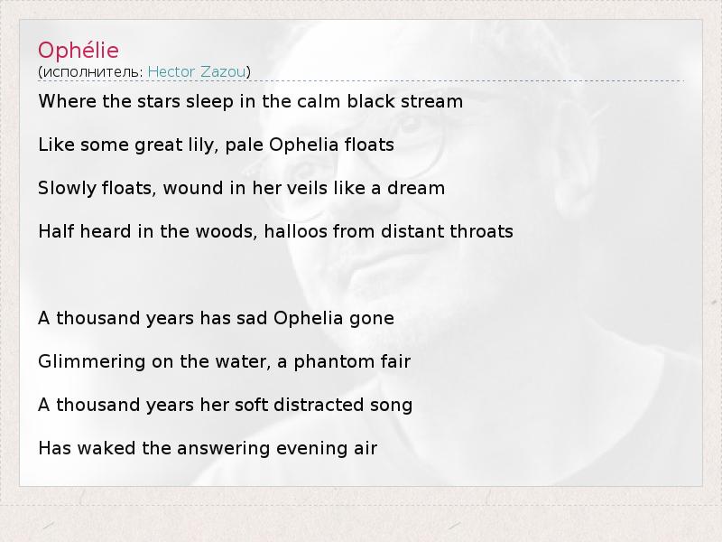 Where the stars sleep in the calm black stream Like some great lily, pale Ophelia floats Slowly floats, wound in her veils like a dream Half heard in the woods, halloos from distant throats A thousand years has sad Ophelia gone Glimmering on the water, a phantom fair A thousand years her soft distracted song Has waked the answering evening air